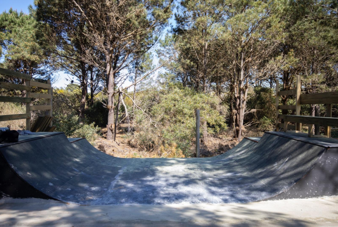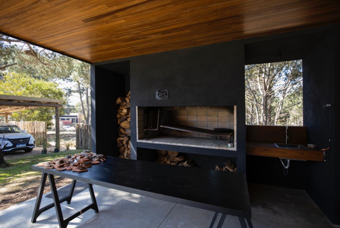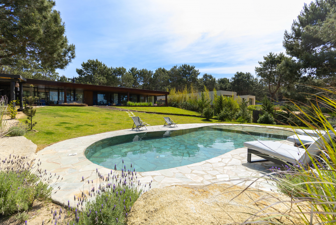 Gran galería con parrillero, piscina climatizada, construcción en piedra.