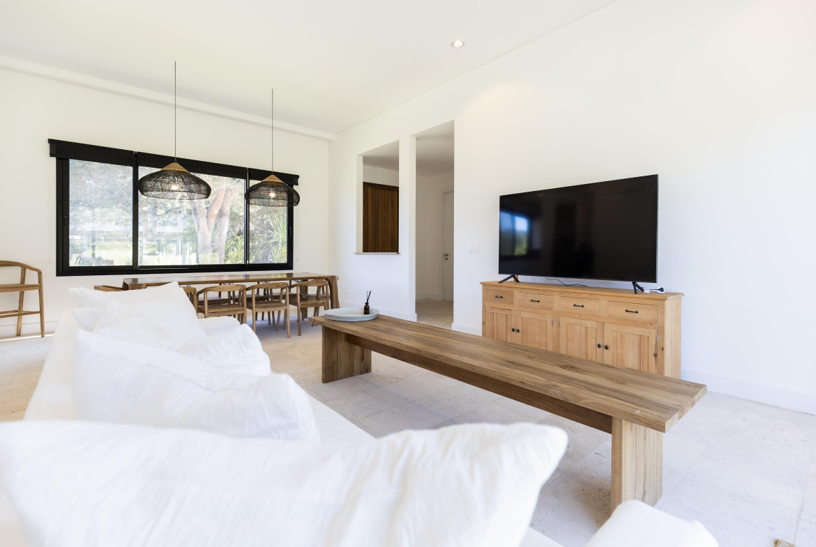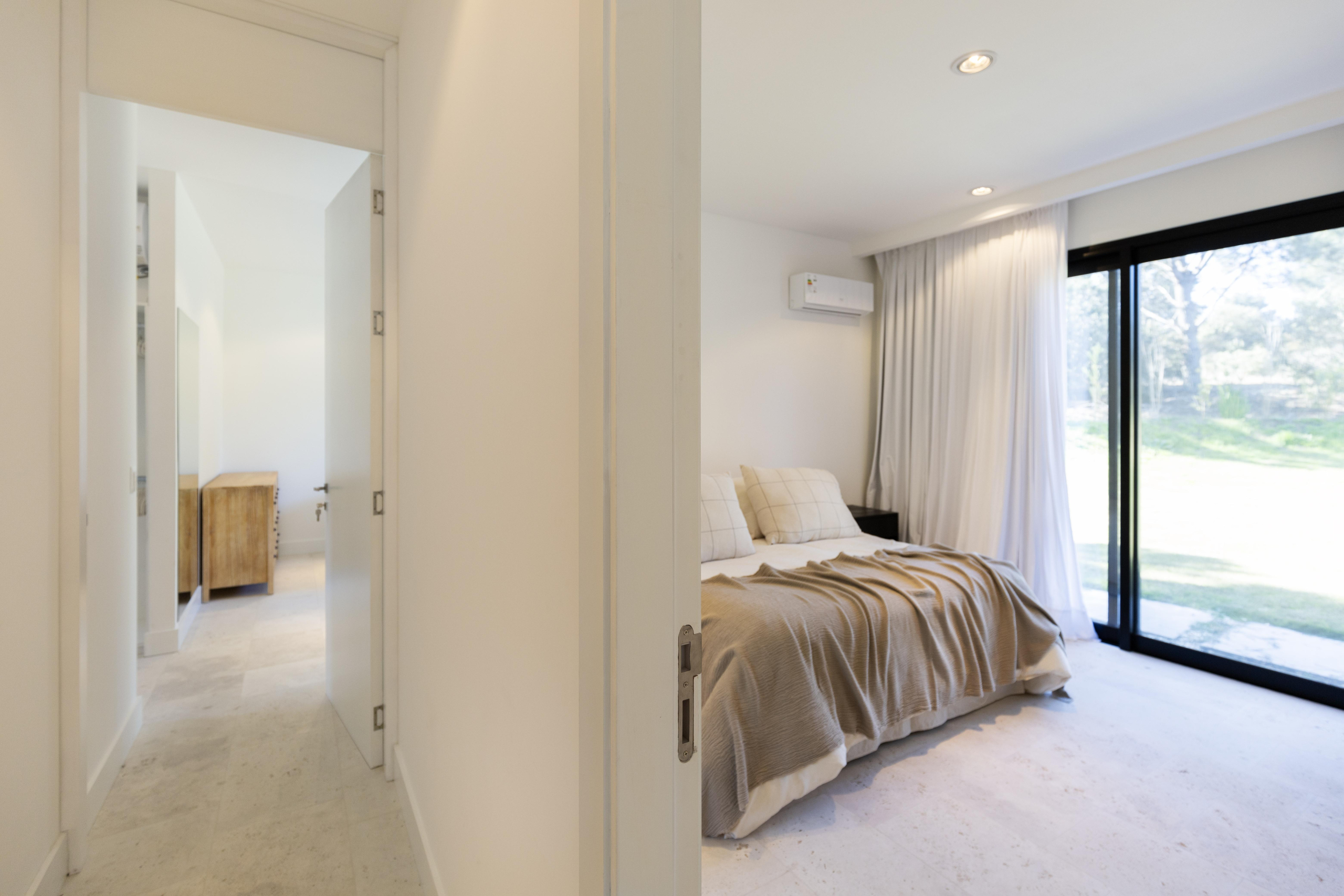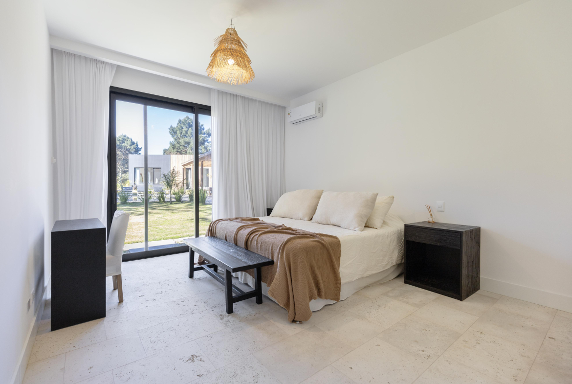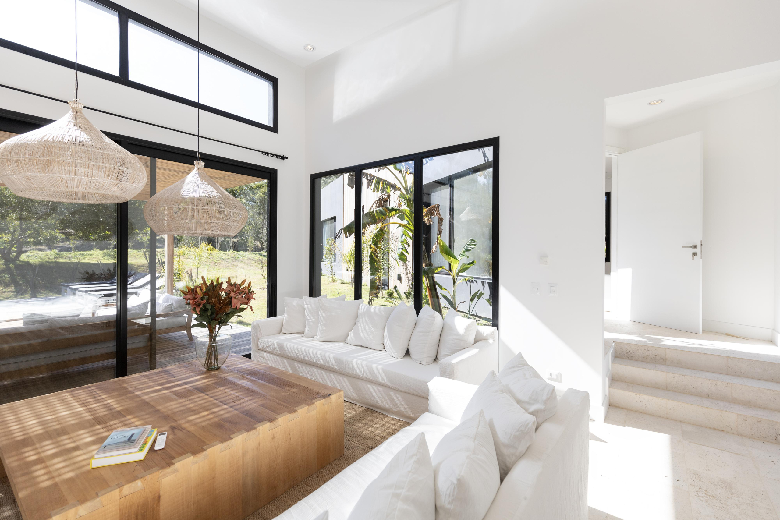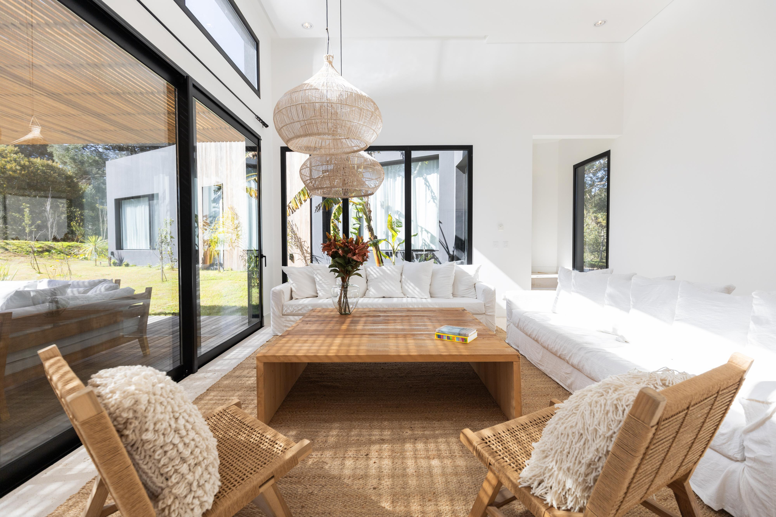 Principal: El primer bloque de la casa es el corazón de la residencia, un amplios espacio abierto que invita a la convivencia y al descanso. La sala de estar, con sus ventanales de piso a techo, ofrece vistas al jardin y piscina y al paisaje circundante. La cocina equipada con electrodomésticos de última generación Este bloque también alberga el dormitorio principal, un refugio de lujo con un baño en suite, vestidor y acceso directo a una terraza con vista al jardin, y un play room con tv y audio de calidad. Este espacio cuenta con habitacion de servicio y lavadero.