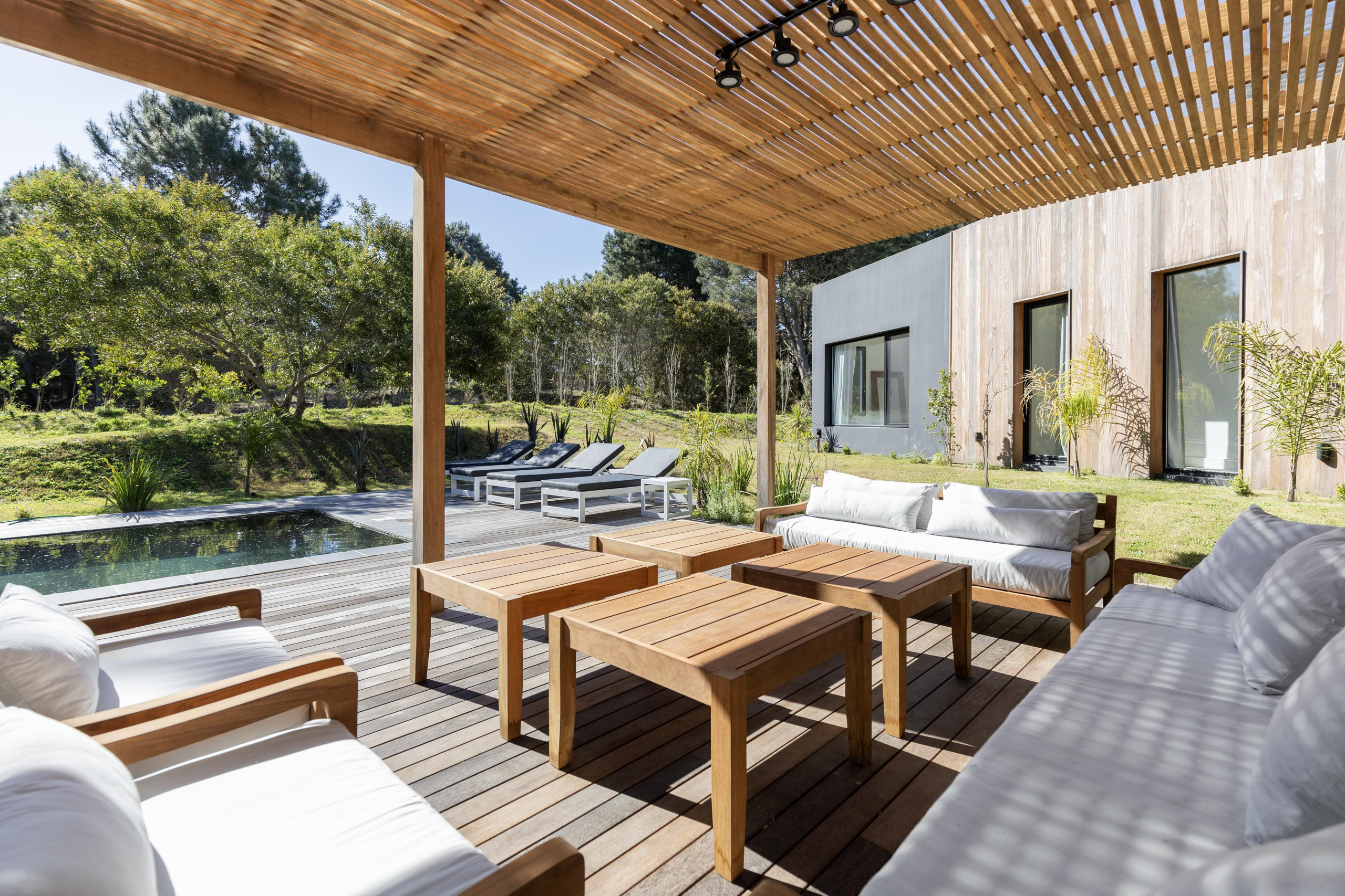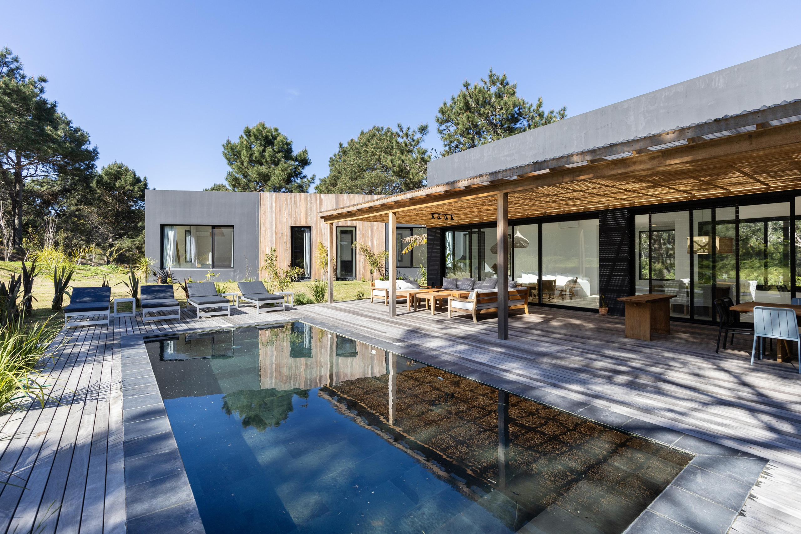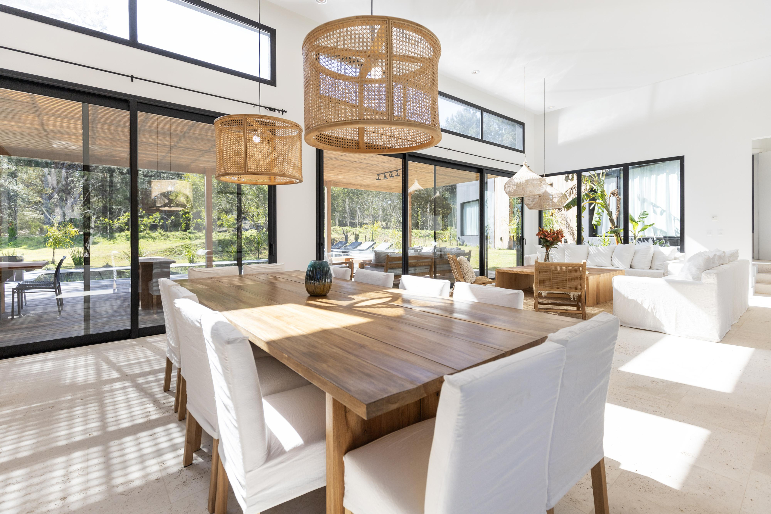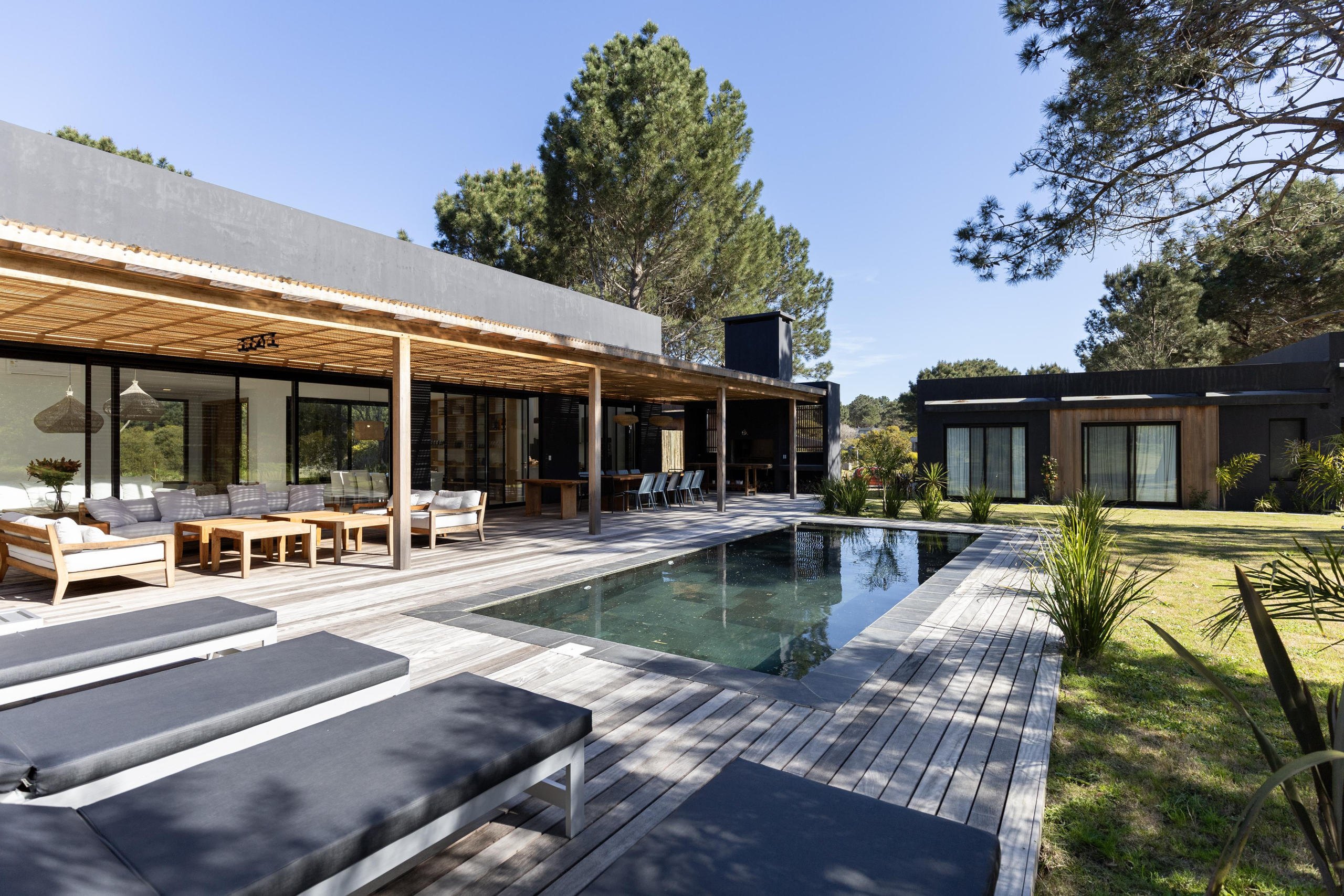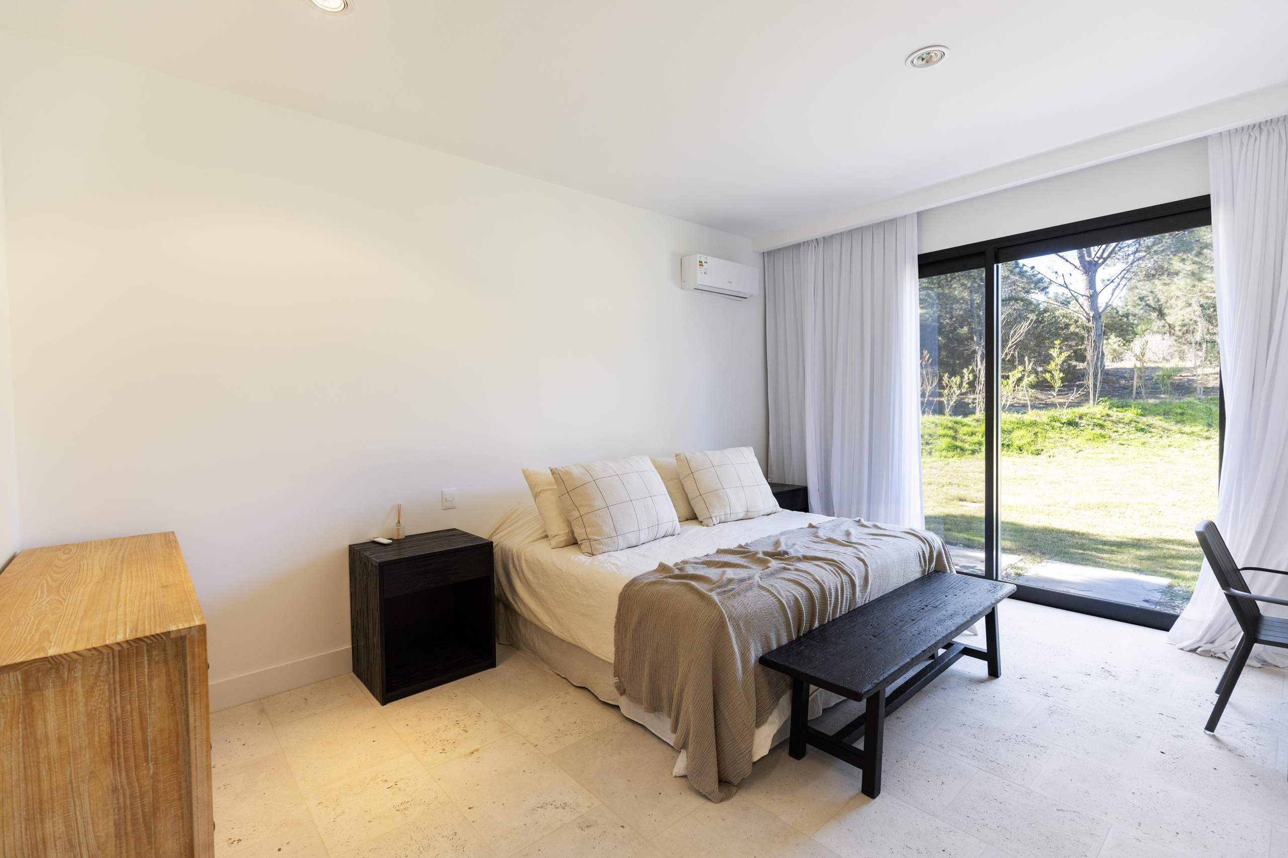 Principal: El primer bloque de la casa es el corazón de la residencia, un amplios espacio abierto que invita a la convivencia y al descanso. La sala de estar, con sus ventanales de piso a techo, ofrece vistas al jardin y piscina y al paisaje circundante. La cocina equipada con electrodomésticos de última generación Este bloque también alberga el dormitorio principal, un refugio de lujo con un baño en suite, vestidor y acceso directo a una terraza con vista al jardin, y un play room con tv y audio de calidad. Este espacio cuenta con habitacion de servicio y lavadero.