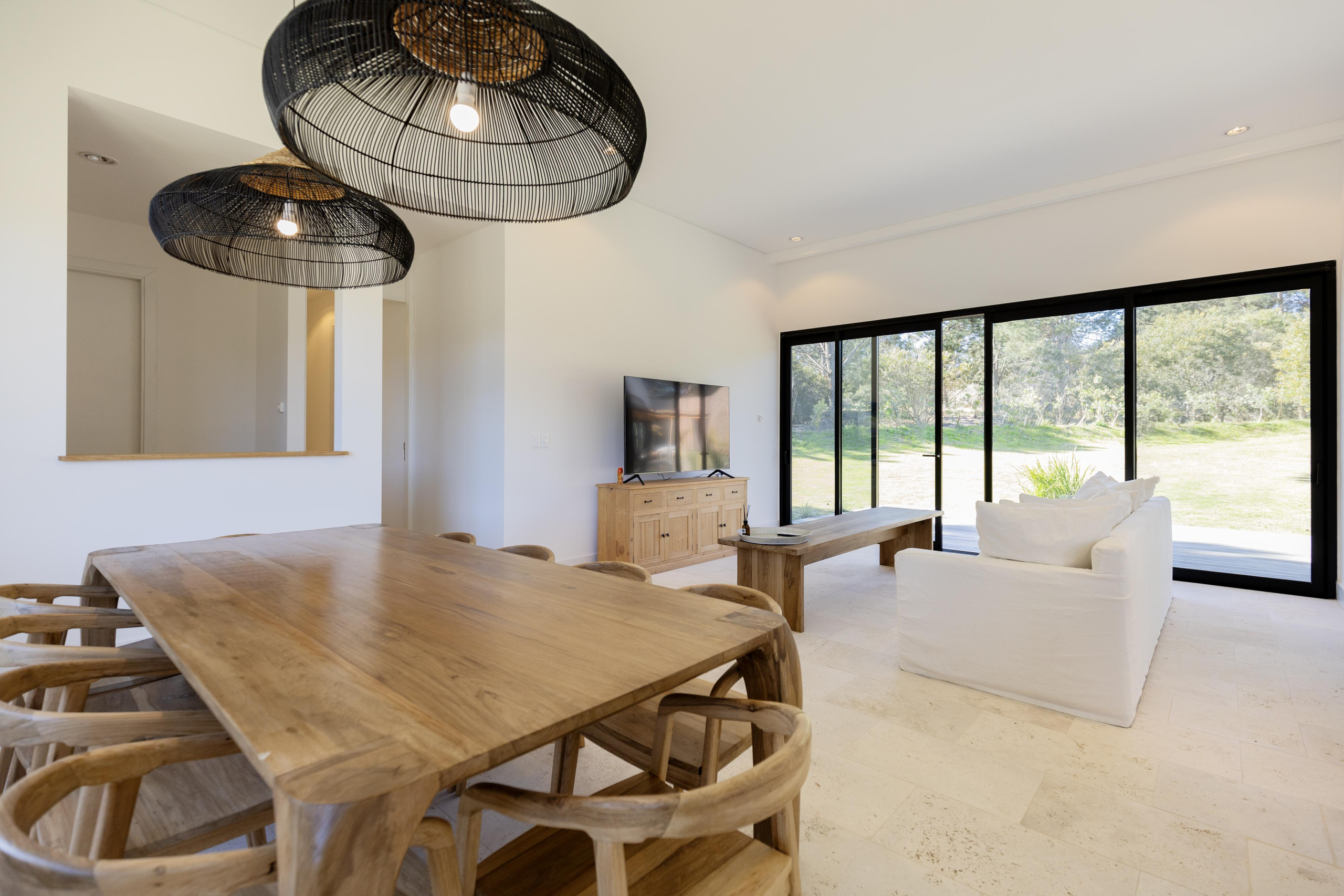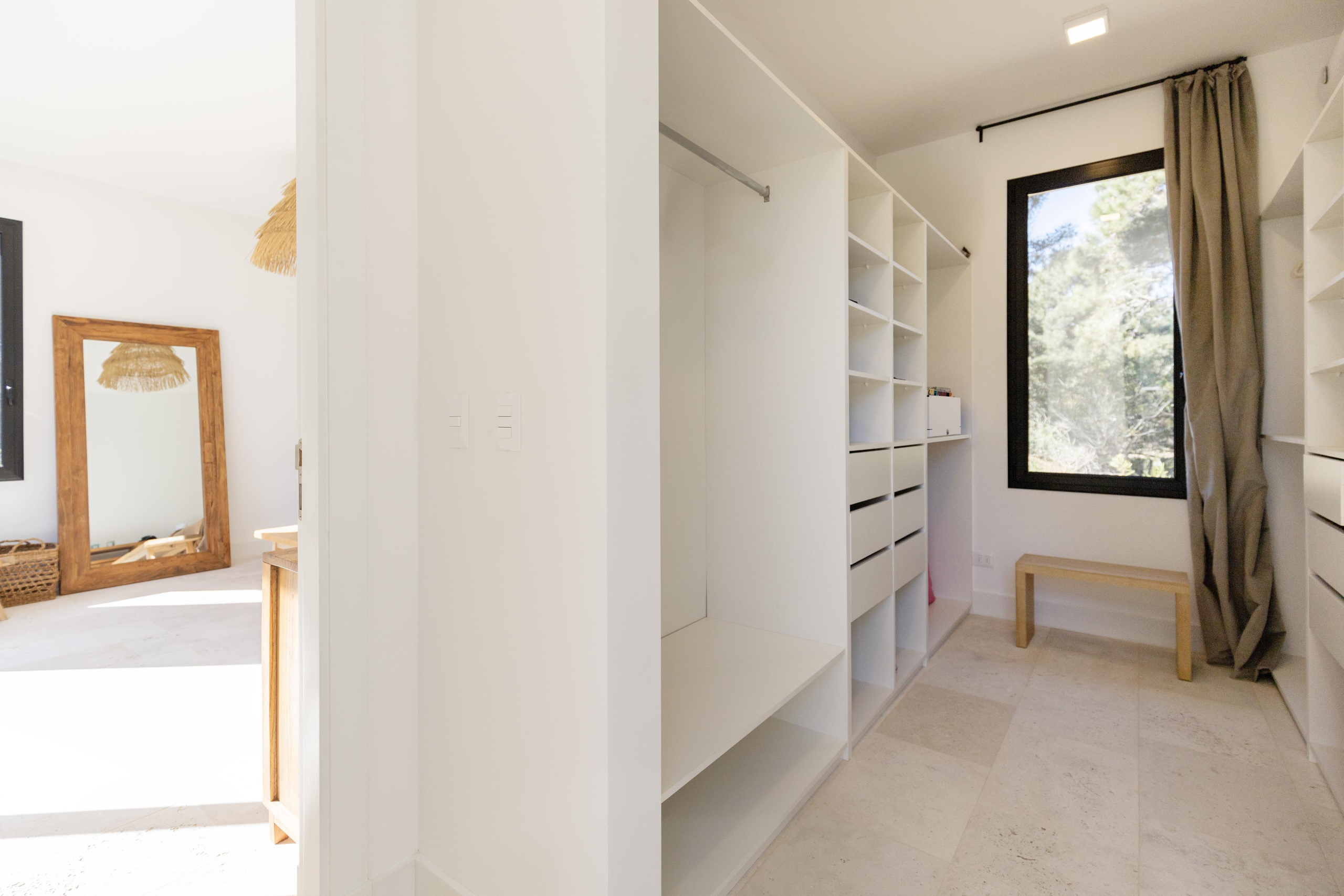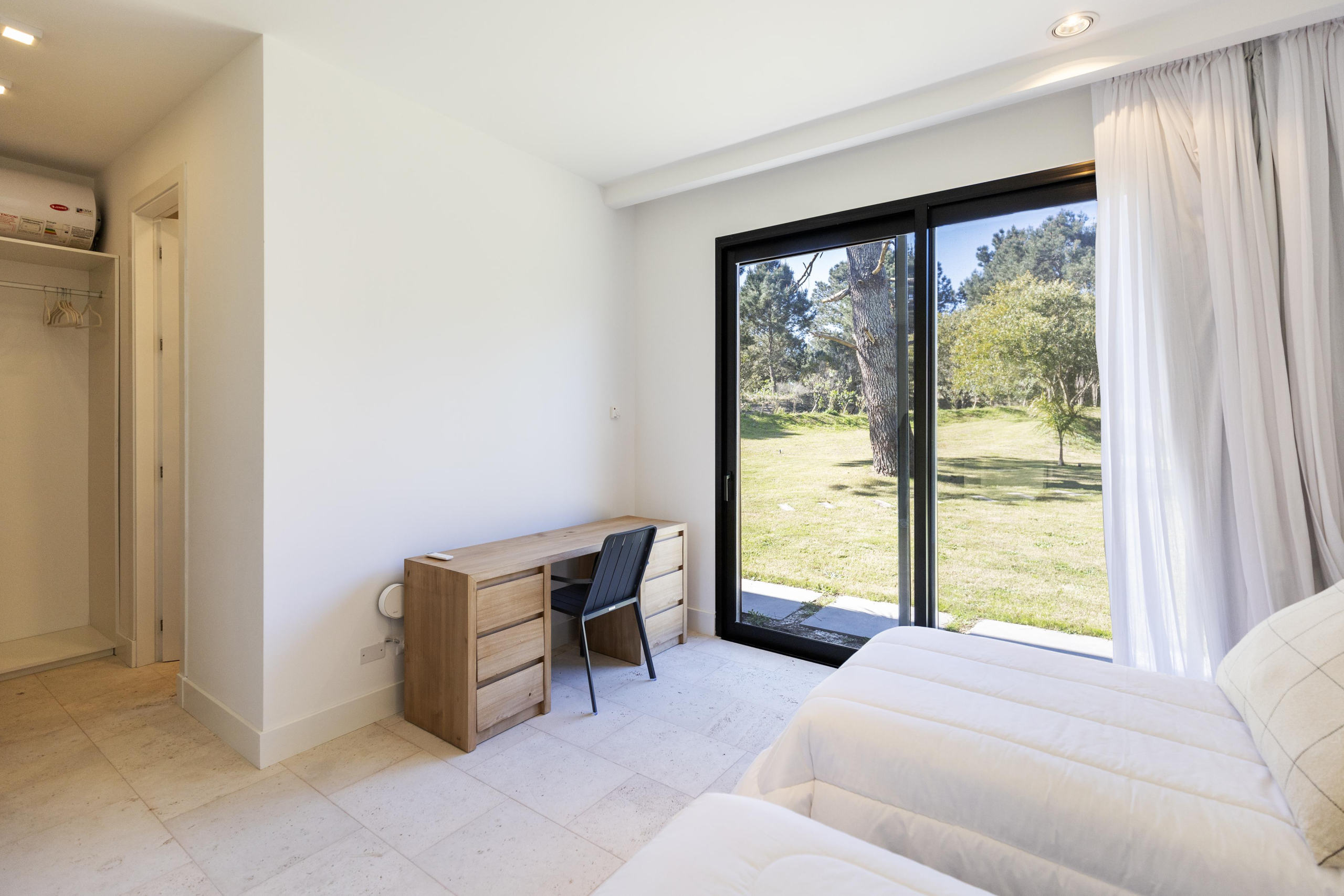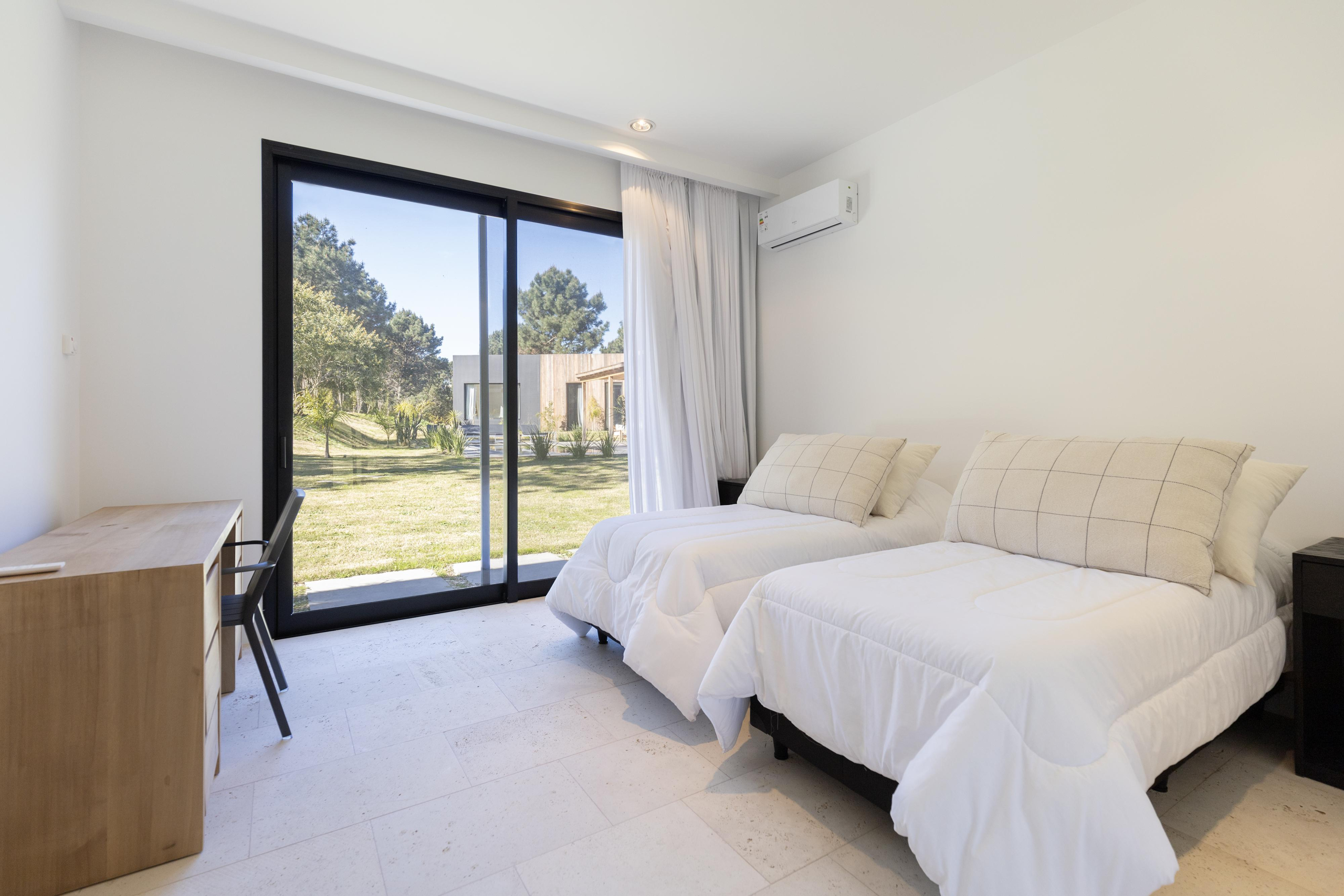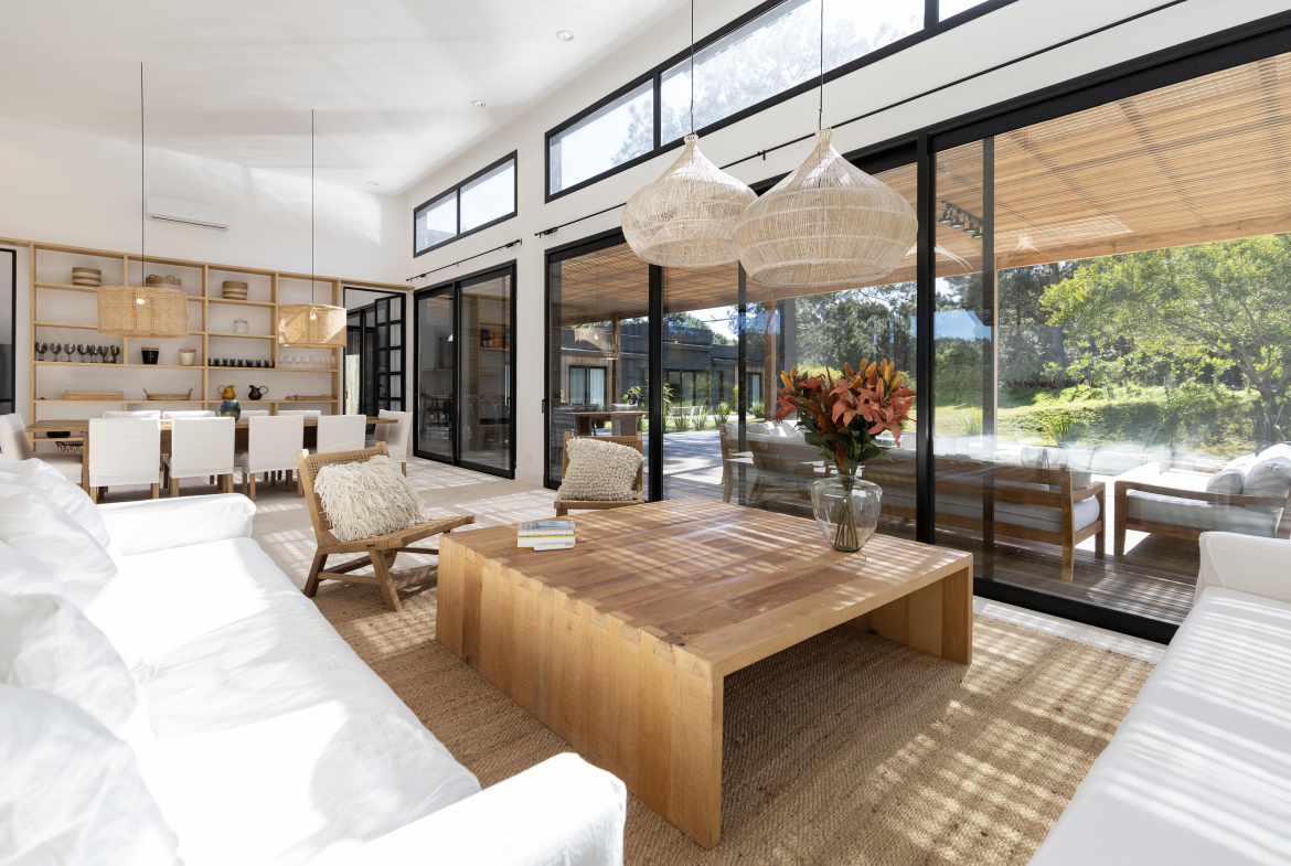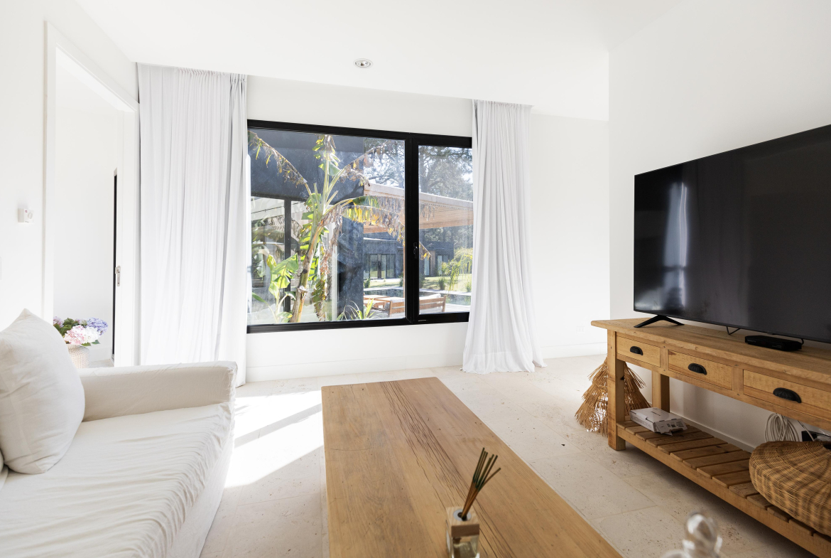 Principal: El primer bloque de la casa es el corazón de la residencia, un amplios espacio abierto que invita a la convivencia y al descanso. La sala de estar, con sus ventanales de piso a techo, ofrece vistas al jardin y piscina y al paisaje circundante. La cocina equipada con electrodomésticos de última generación Este bloque también alberga el dormitorio principal, un refugio de lujo con un baño en suite, vestidor y acceso directo a una terraza con vista al jardin, y un play room con tv y audio de calidad. Este espacio cuenta con habitacion de servicio y lavadero.