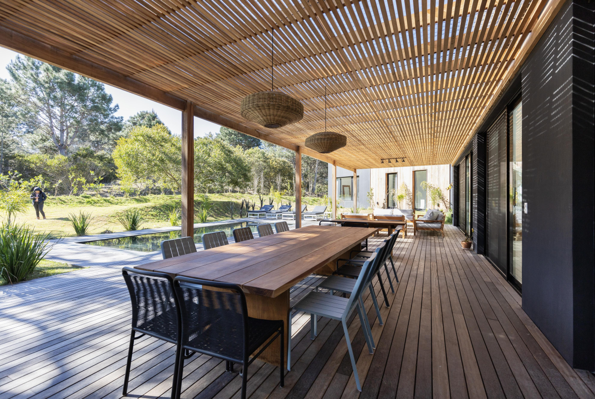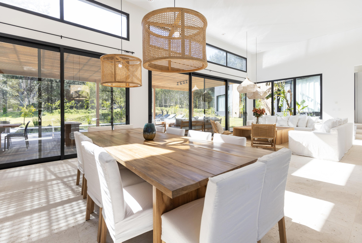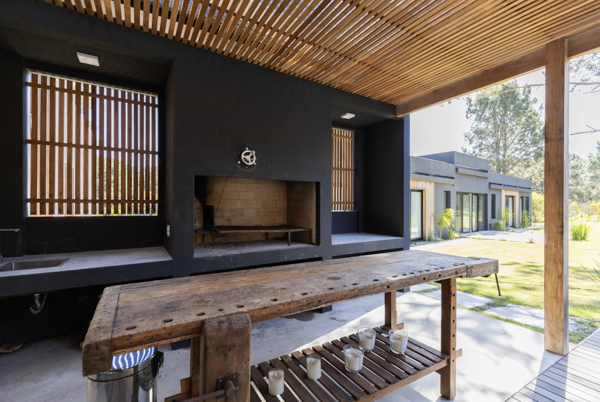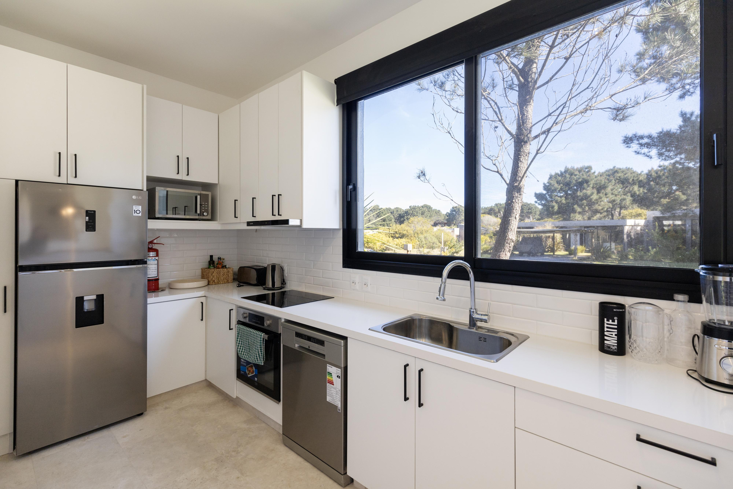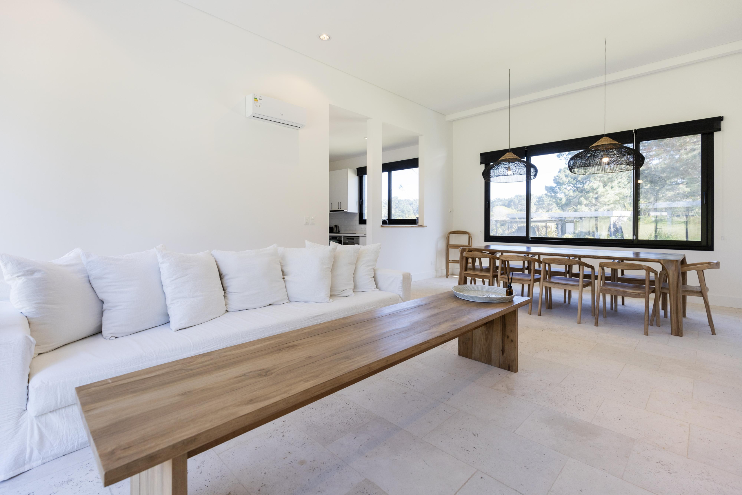 Principal: El primer bloque de la casa es el corazón de la residencia, un amplios espacio abierto que invita a la convivencia y al descanso. La sala de estar, con sus ventanales de piso a techo, ofrece vistas al jardin y piscina y al paisaje circundante. La cocina equipada con electrodomésticos de última generación Este bloque también alberga el dormitorio principal, un refugio de lujo con un baño en suite, vestidor y acceso directo a una terraza con vista al jardin, y un play room con tv y audio de calidad. Este espacio cuenta con habitacion de servicio y lavadero.