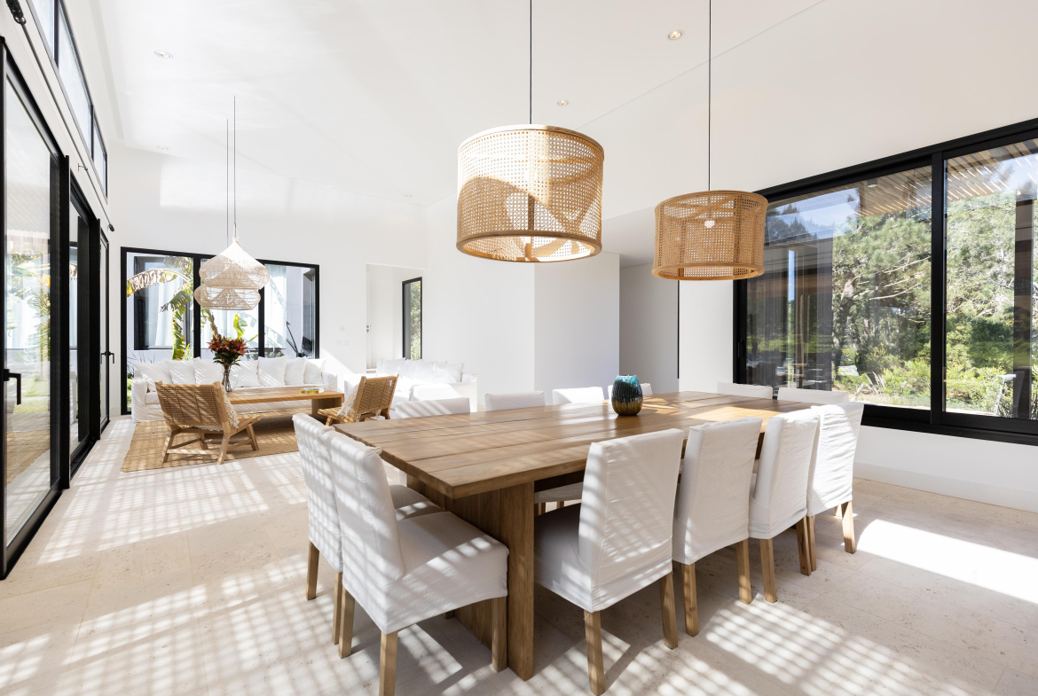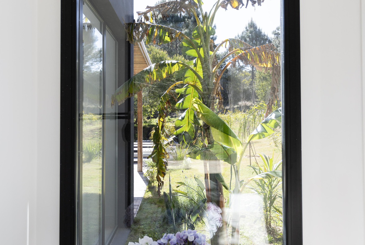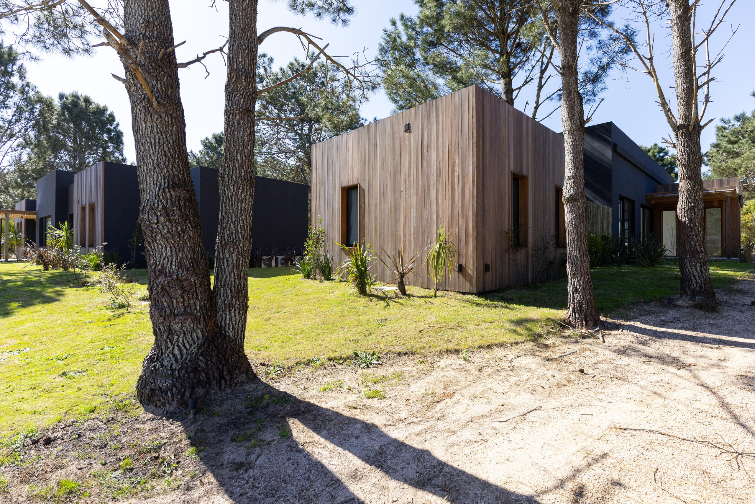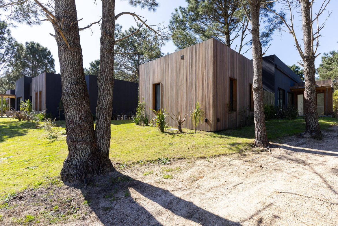 Ambos bloques están separados fisicamente por un pequeño espacio que proporciona una transición suave entre una casa y otra, al tiempo que mantiene la privacidad y la independencia de cada área. La casa está rodeada de arboles y cuenta con una terraza exterior con zona de barbacoa, perfecta para disfrutar del clima y las vistas a la laguna.