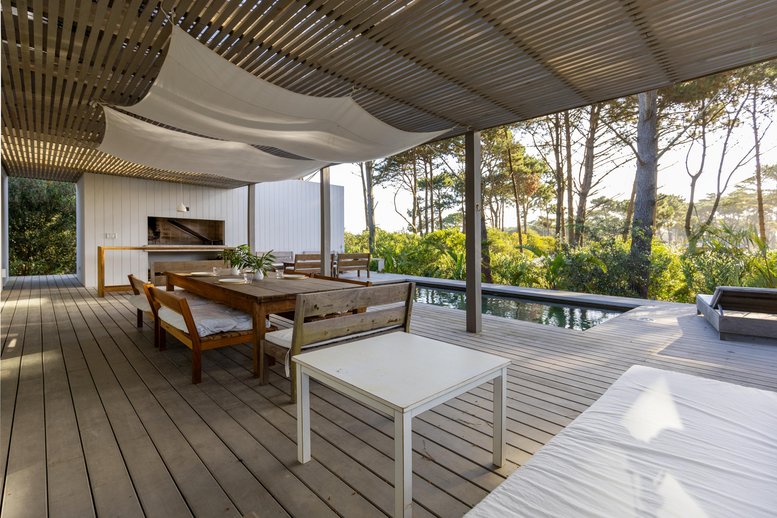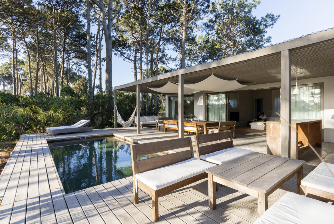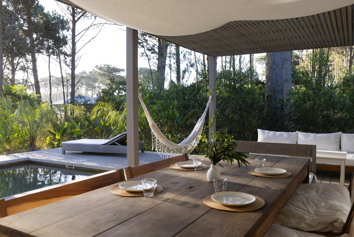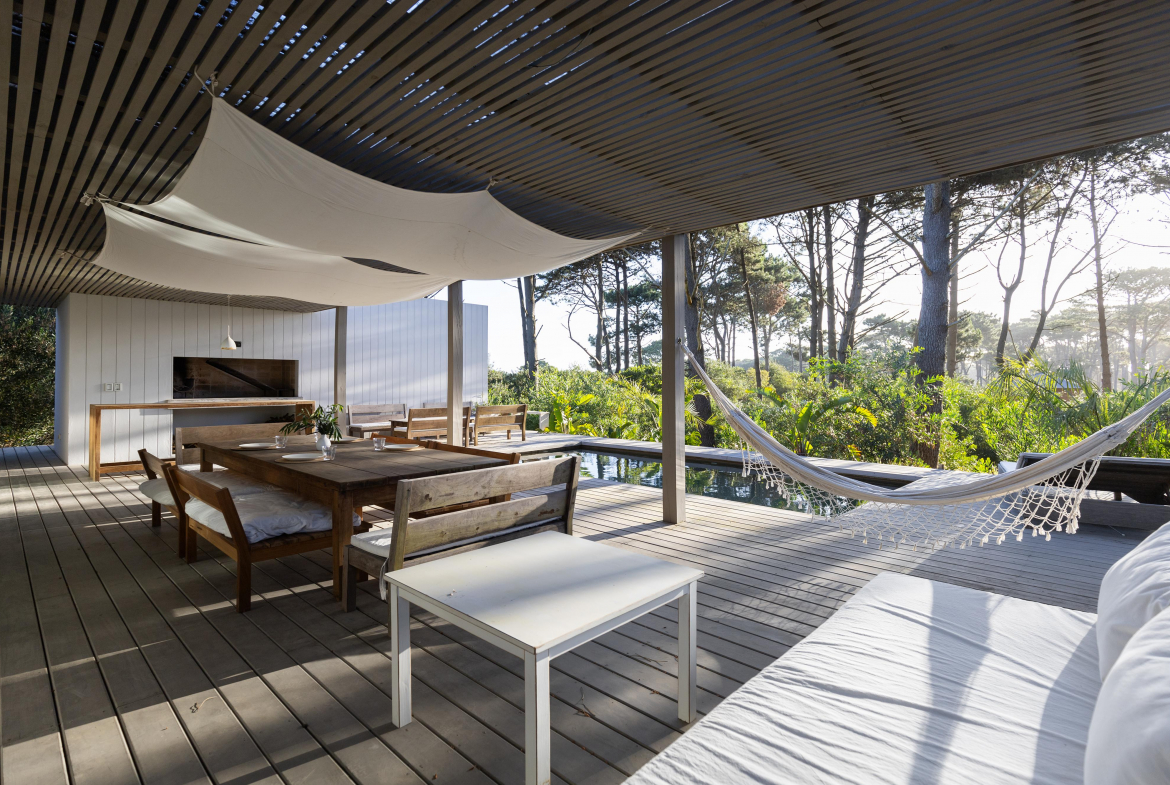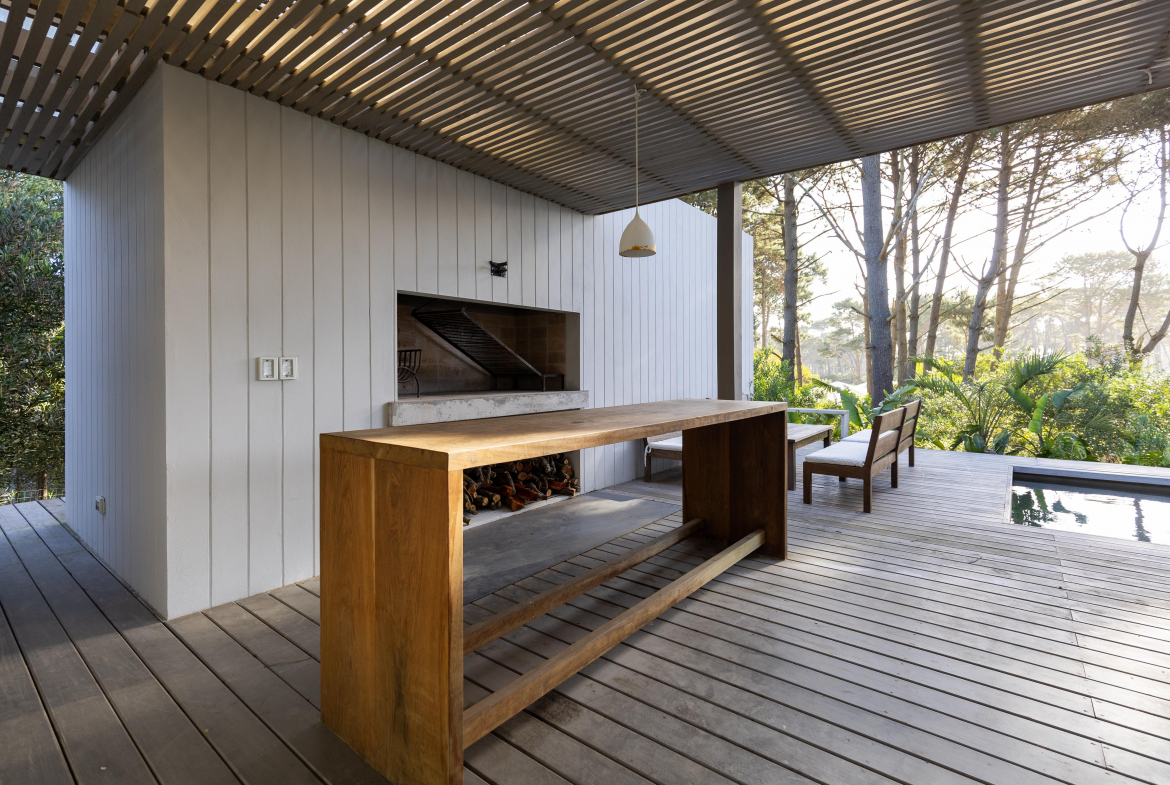 Galería con parrillero techado y living exterior, piscina rodeada de verde.