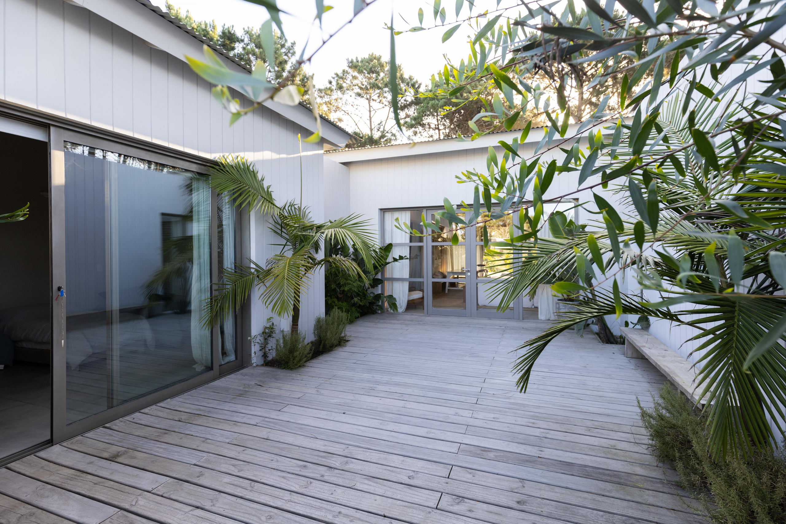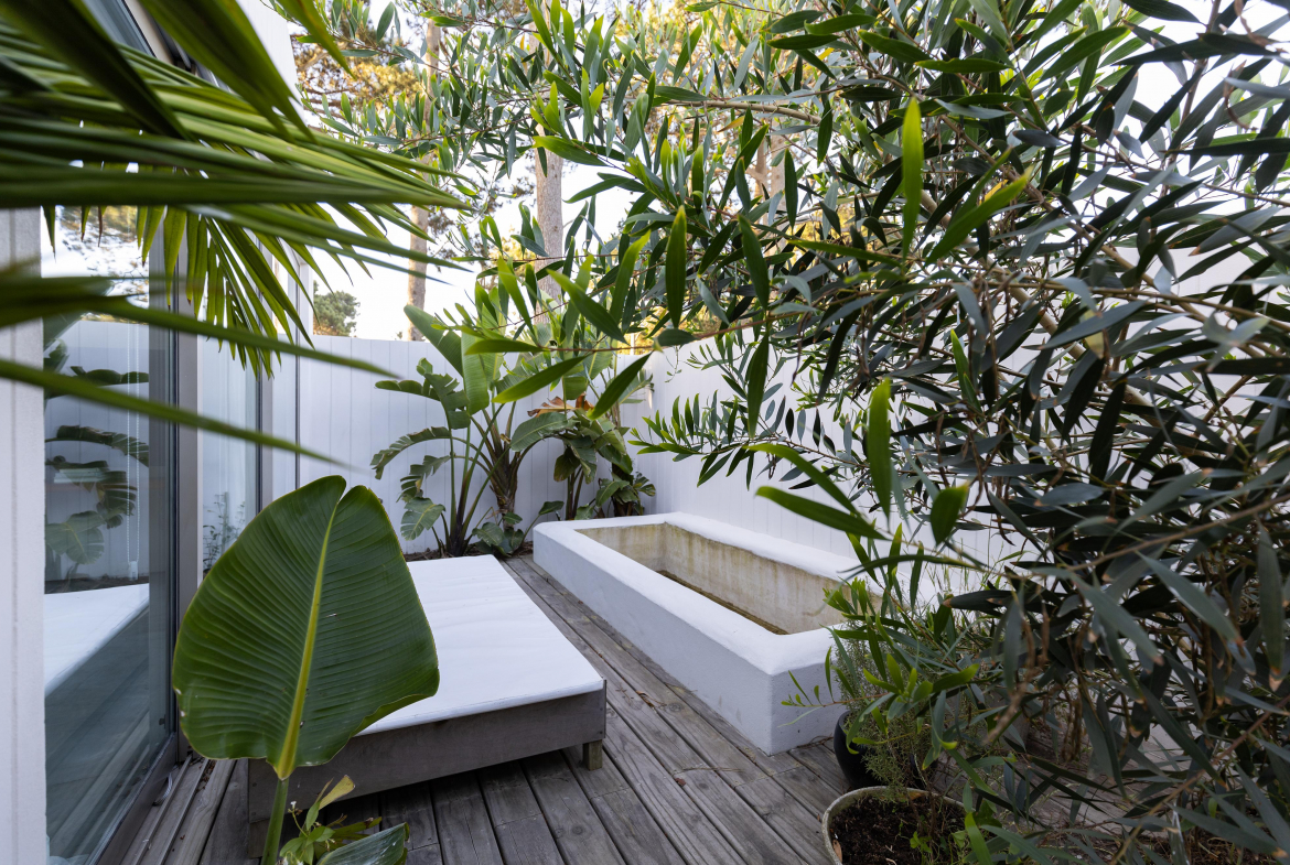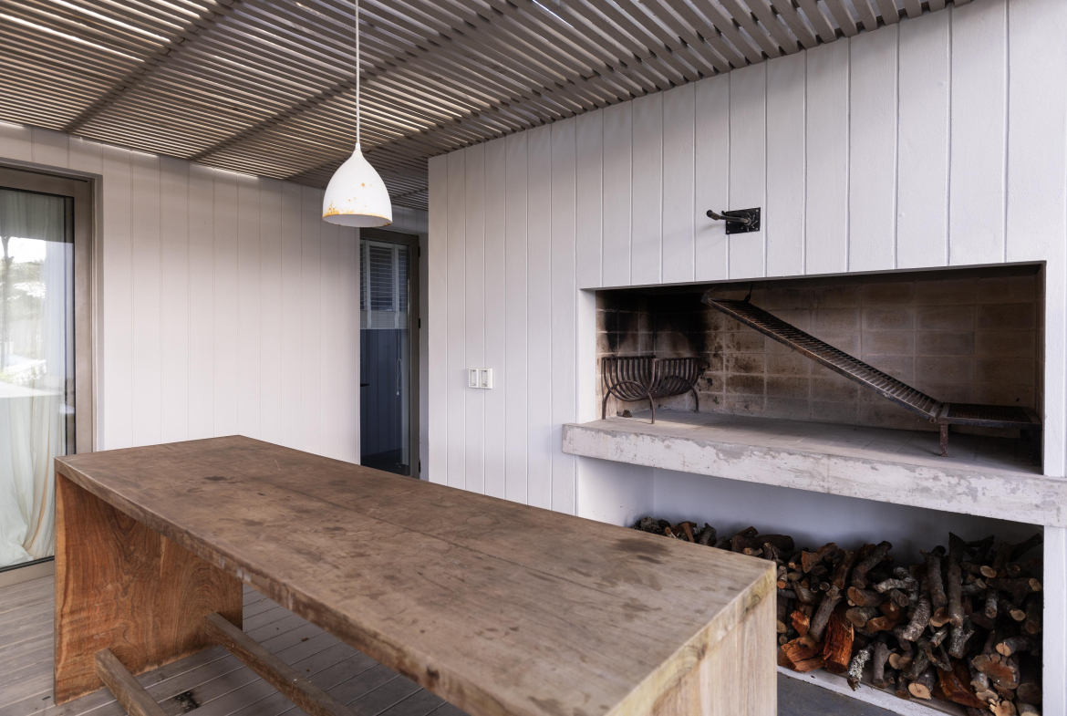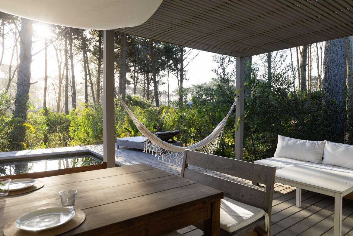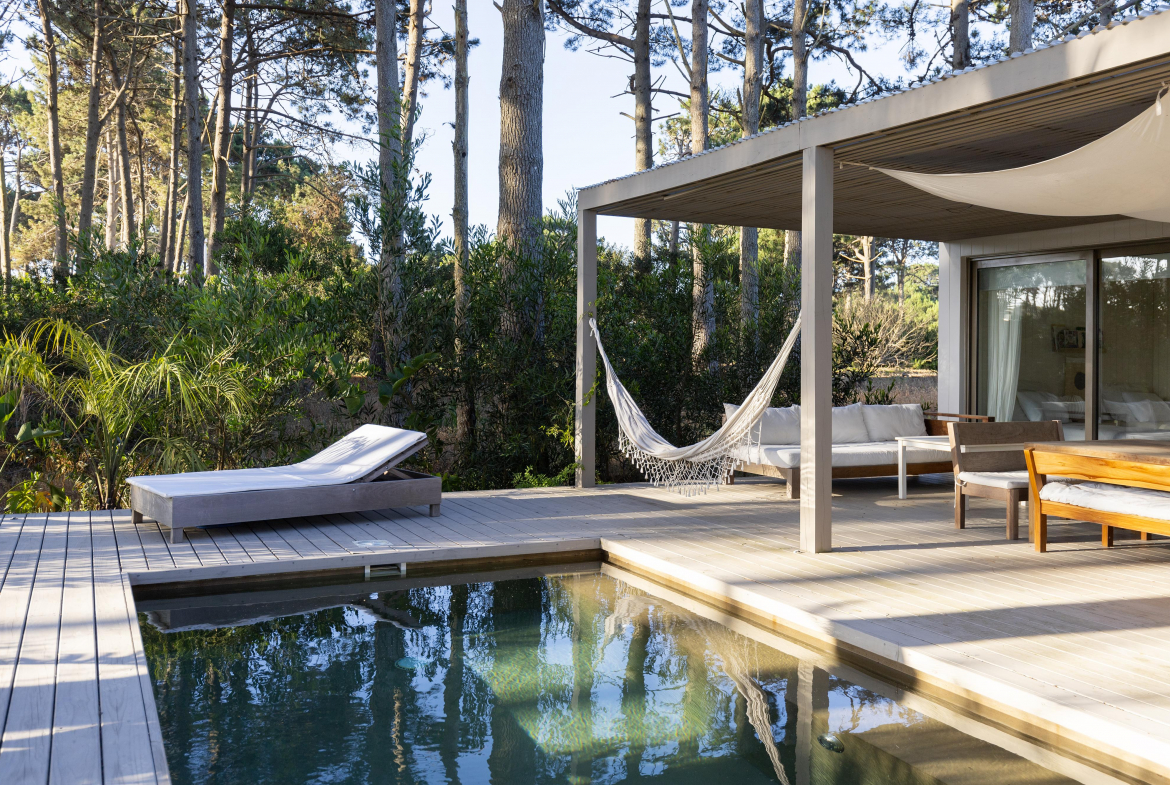 Galería con parrillero techado y living exterior, piscina rodeada de verde.