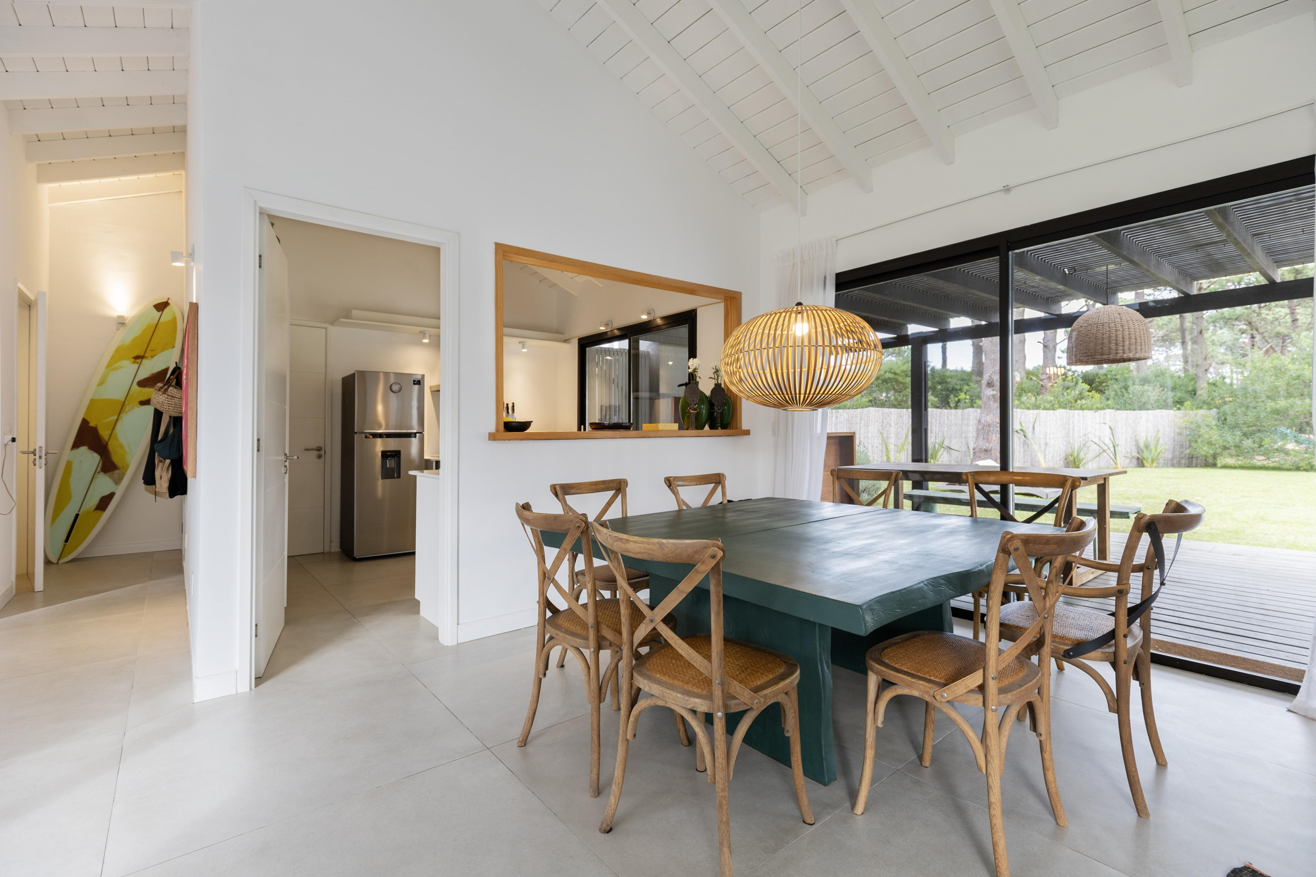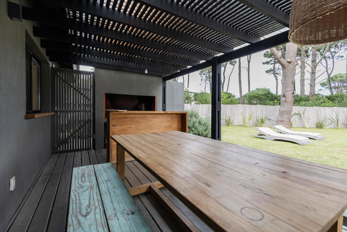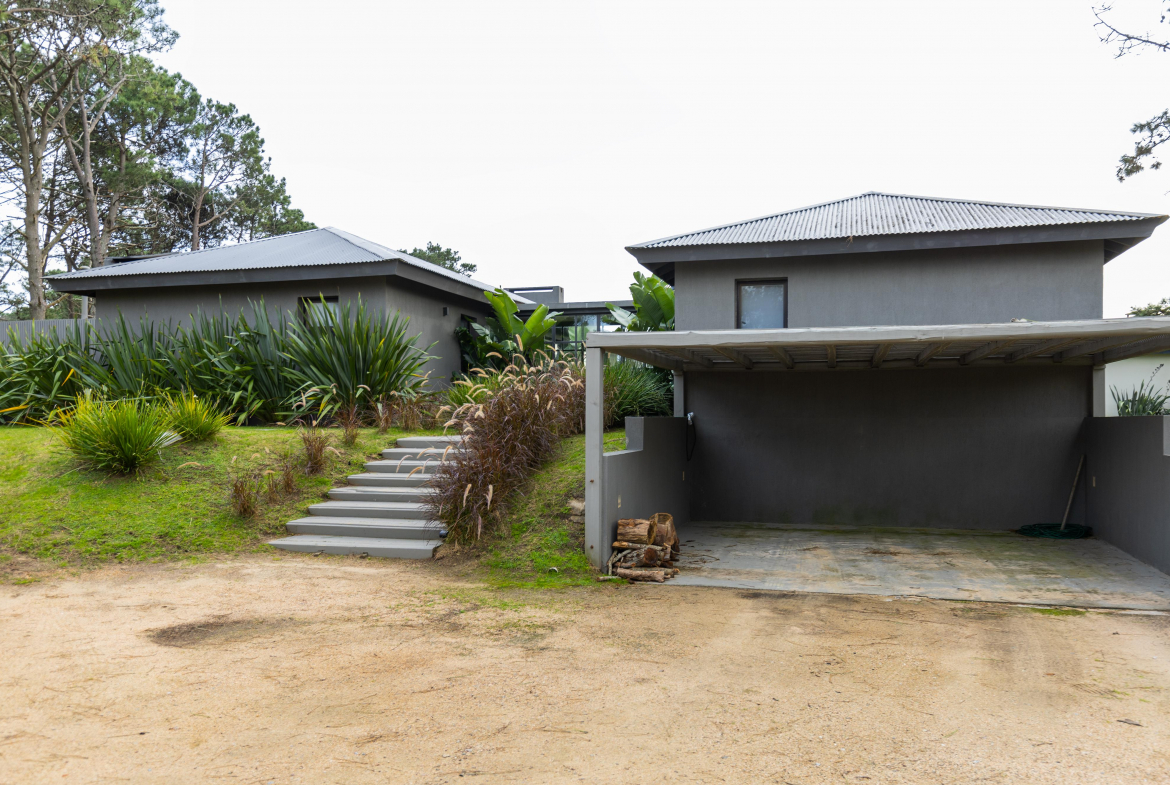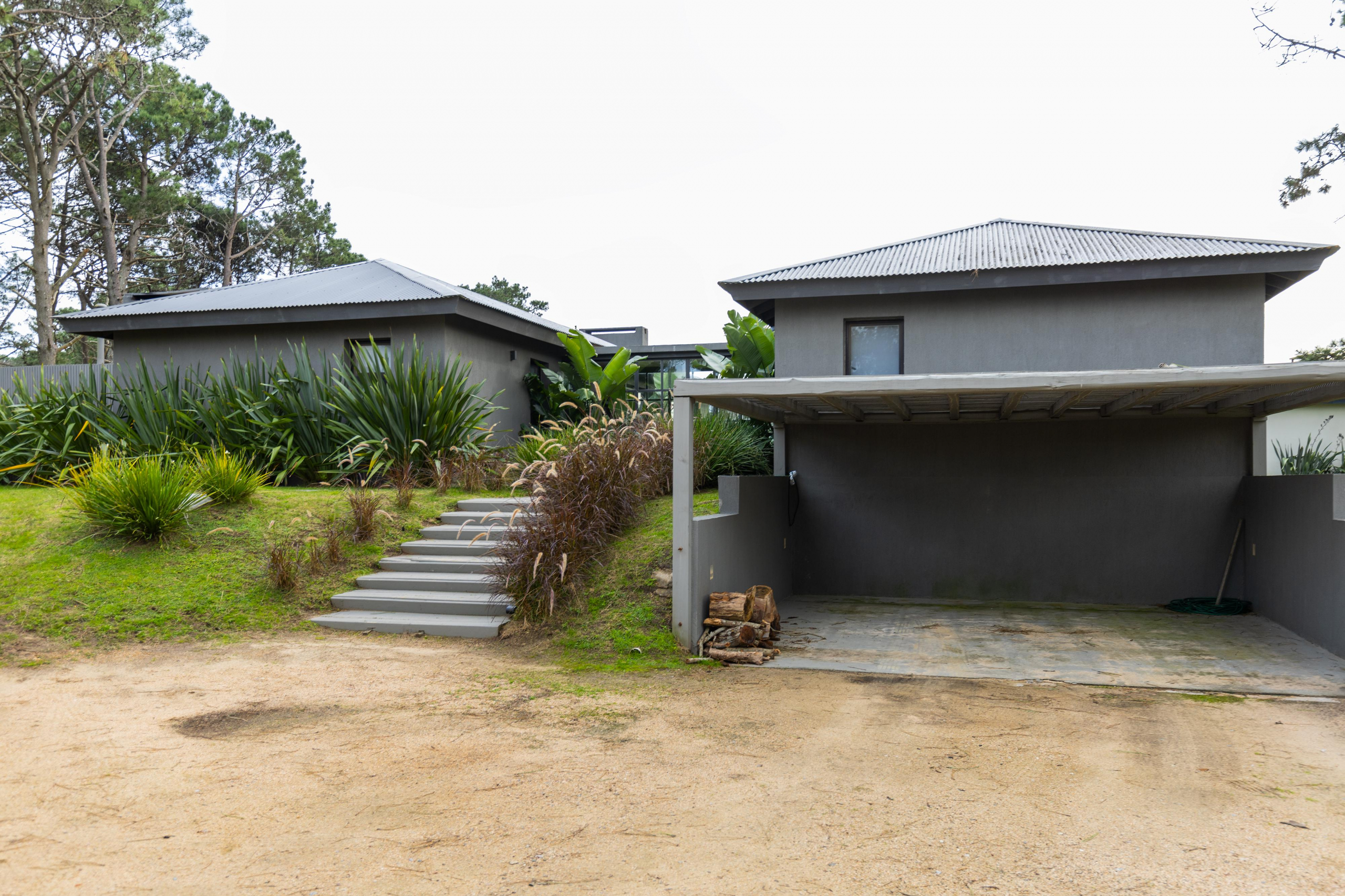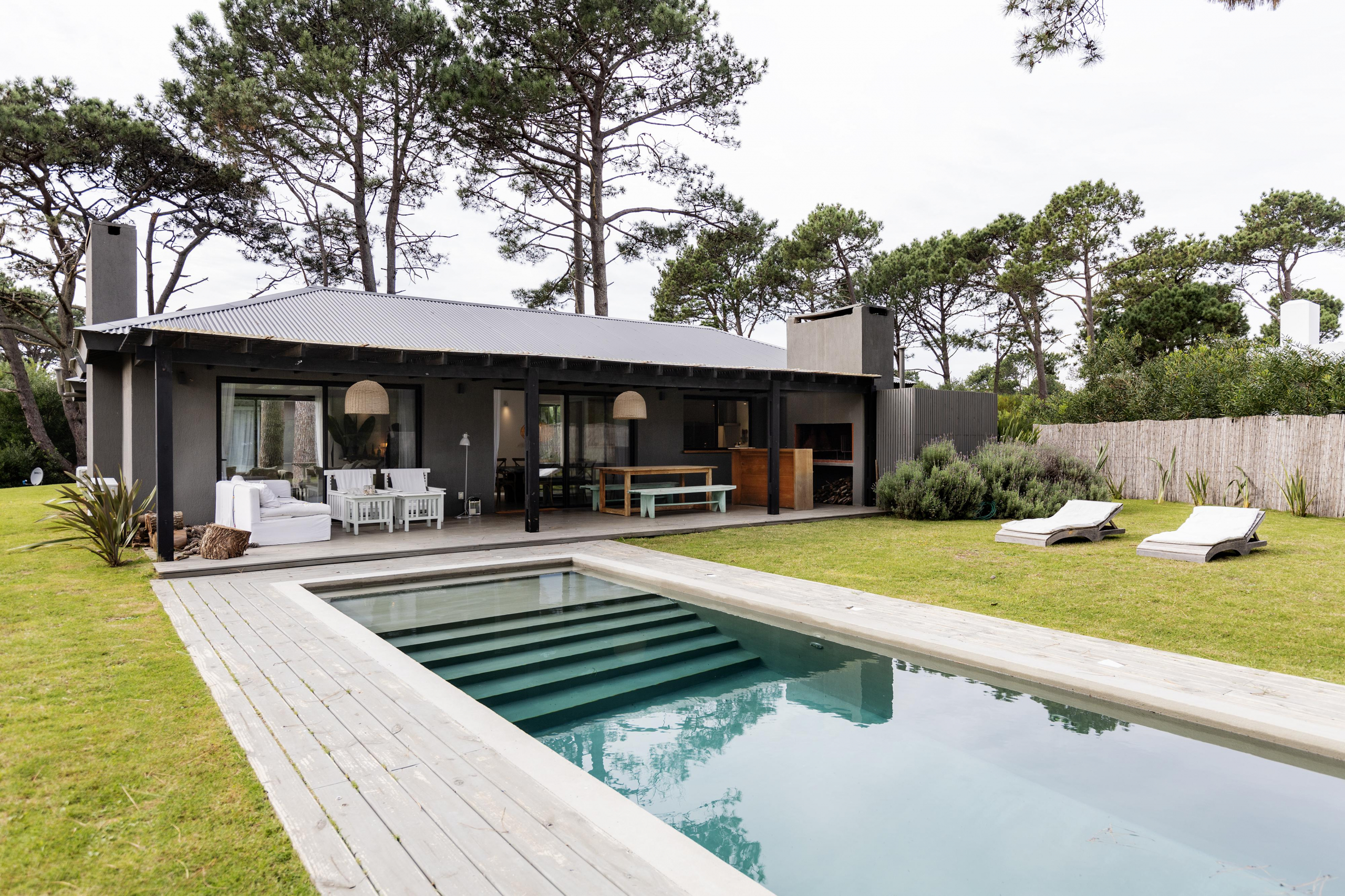 Emplazada en un terreno de mil mts, se desarrolla esta casa en una planta, distribuida en dos módulos, dentro del barrio privado Pinar del Faro.