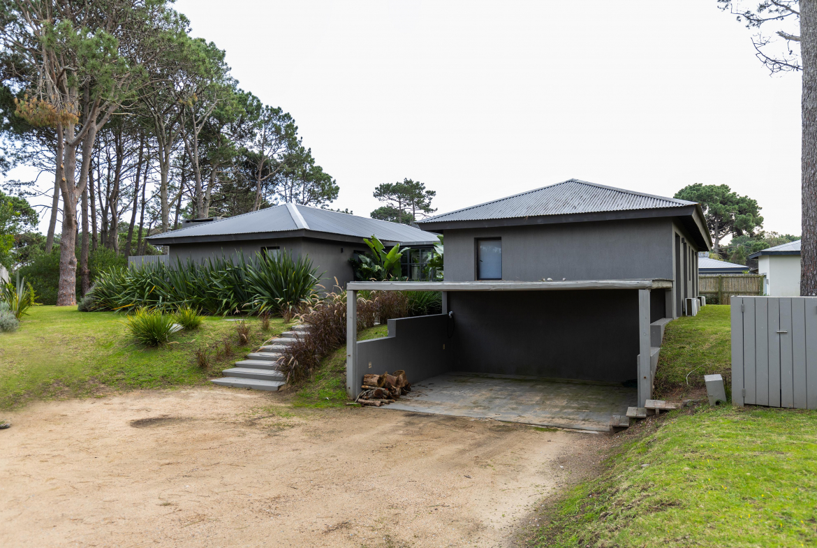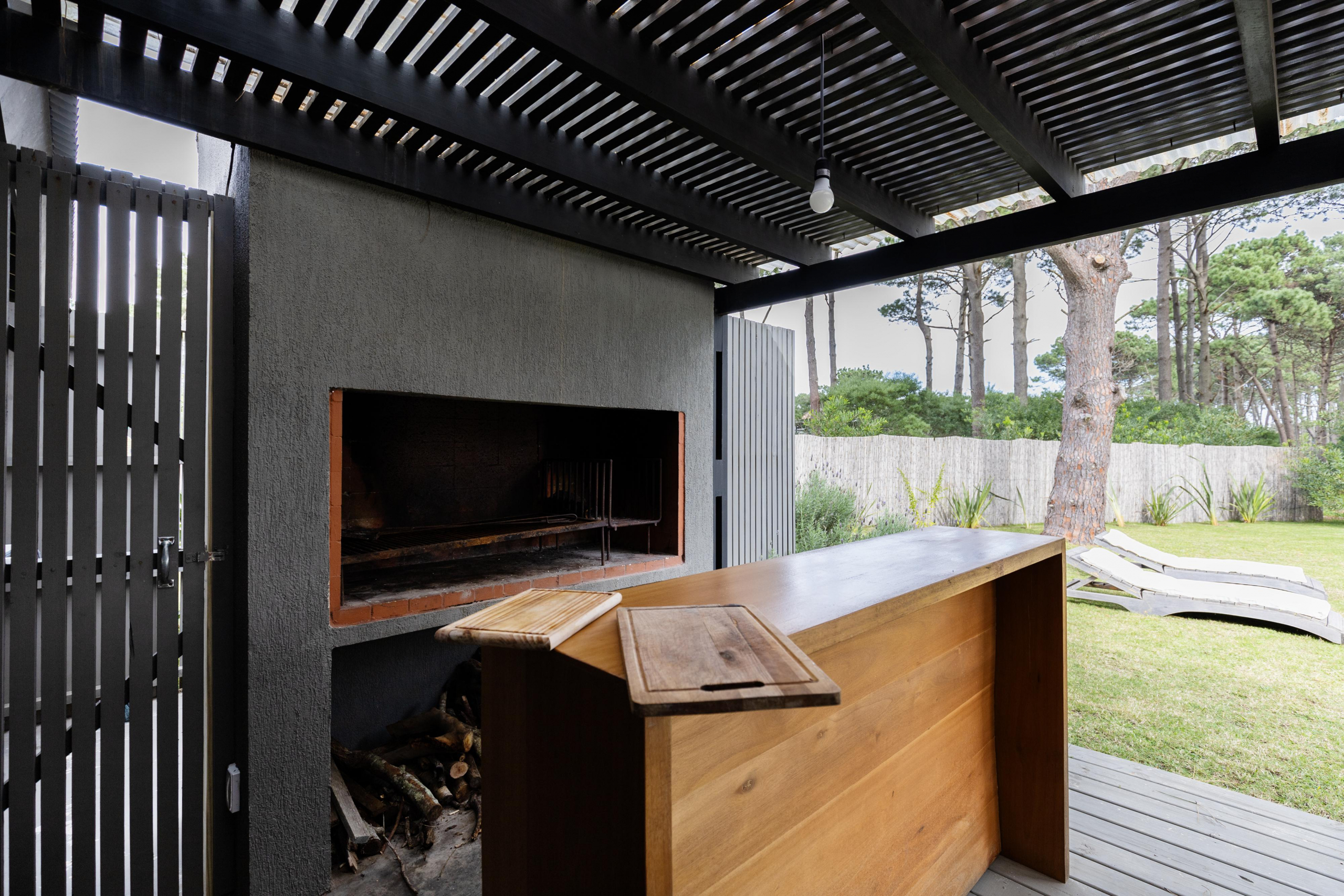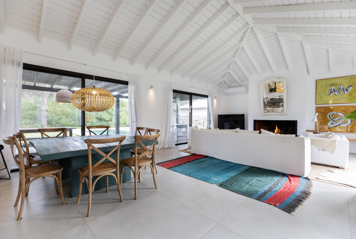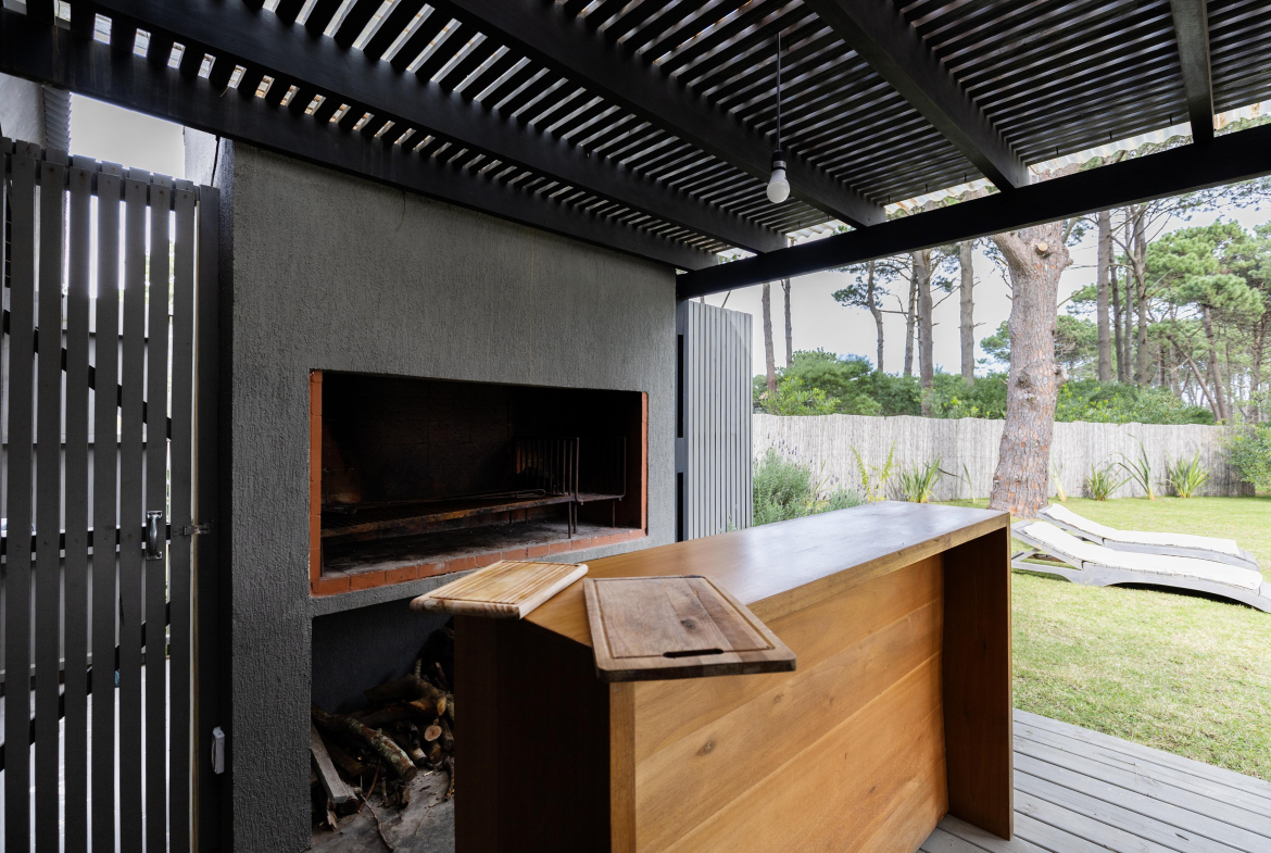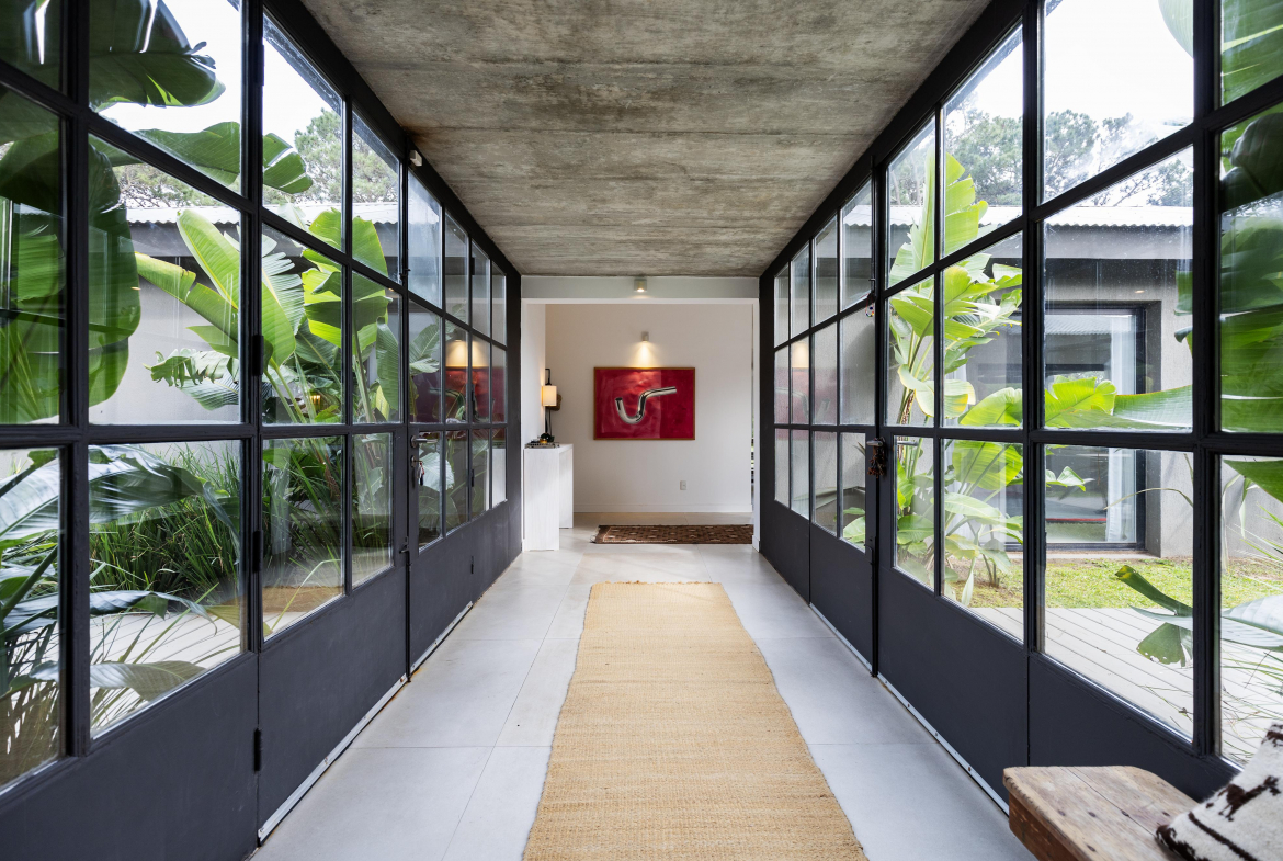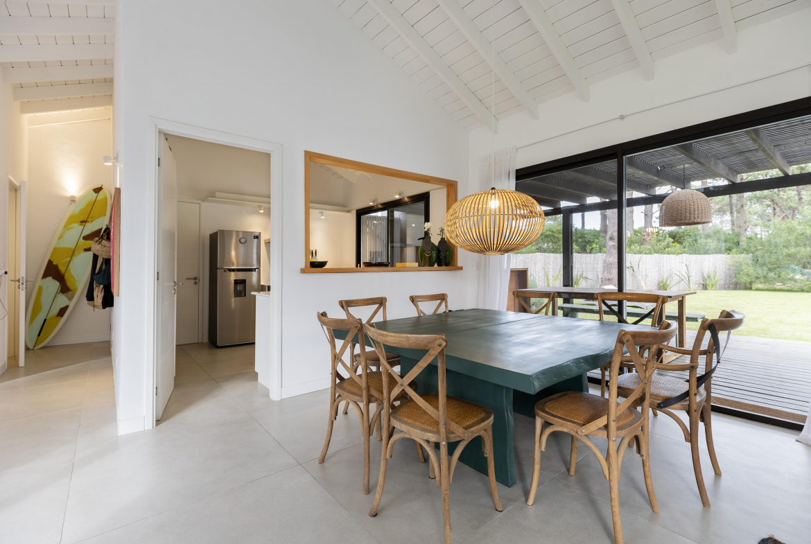 Emplazada en un terreno de mil mts, se desarrolla esta casa en una planta, distribuida en dos módulos, dentro del barrio privado Pinar del Faro.