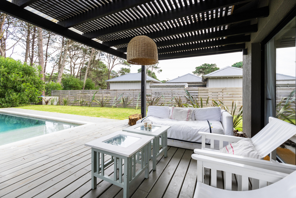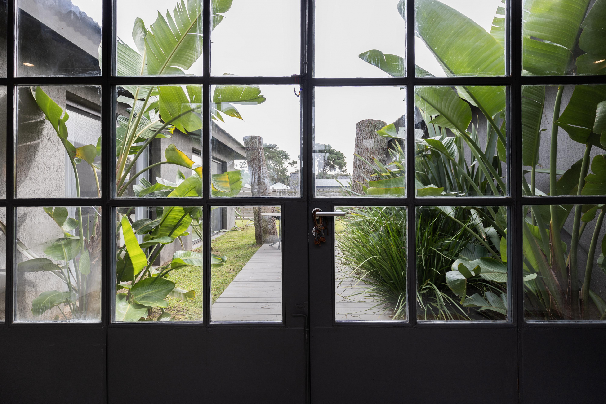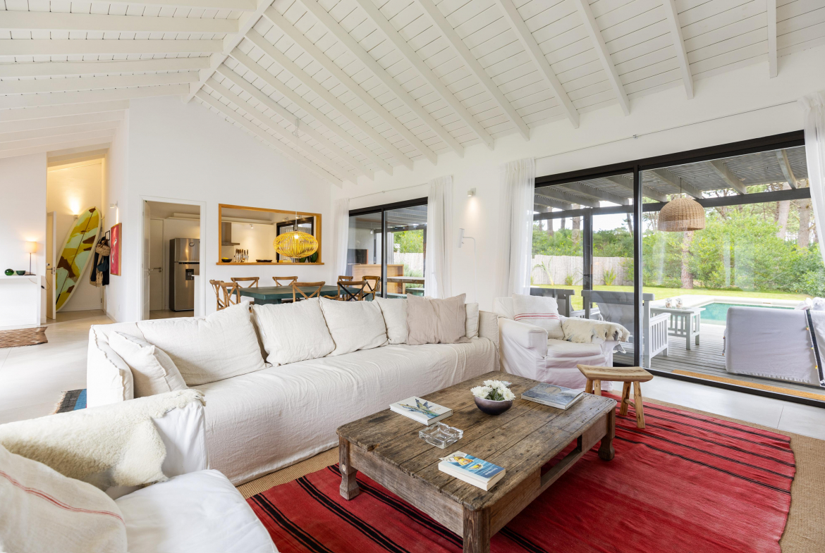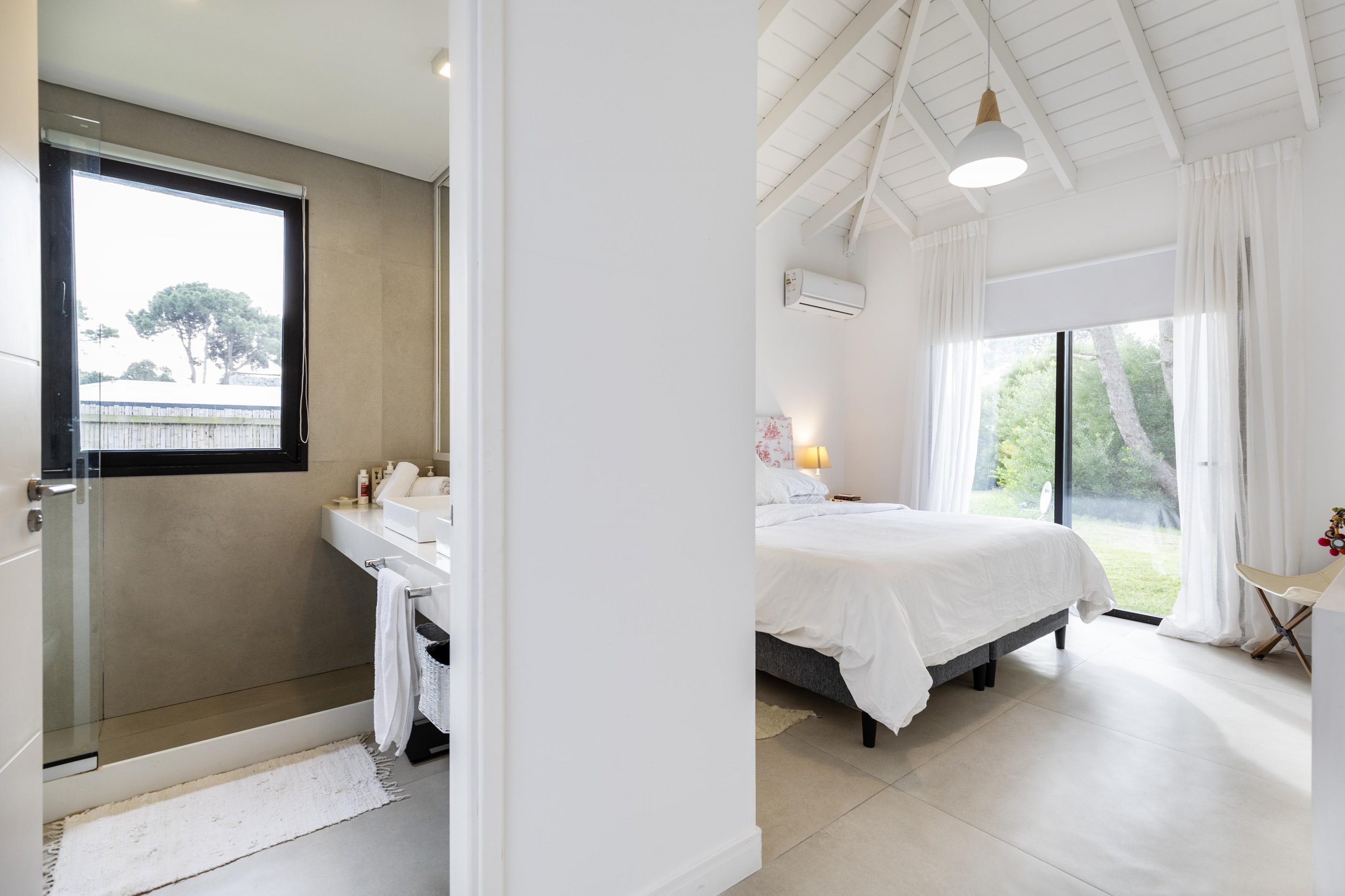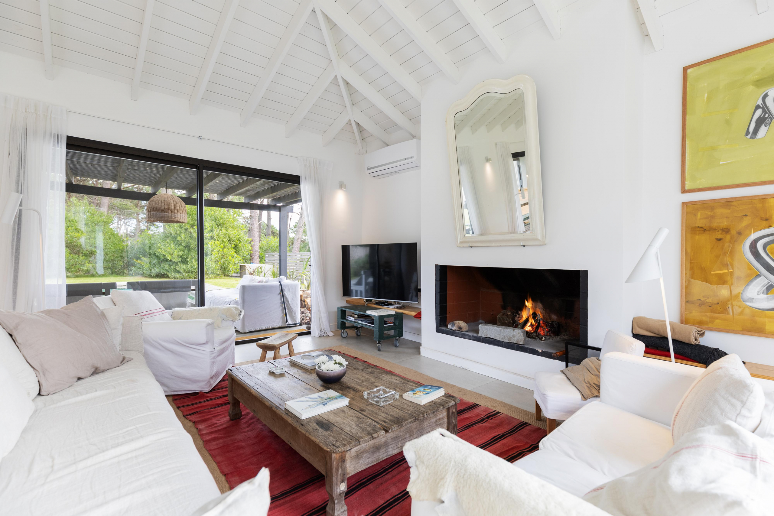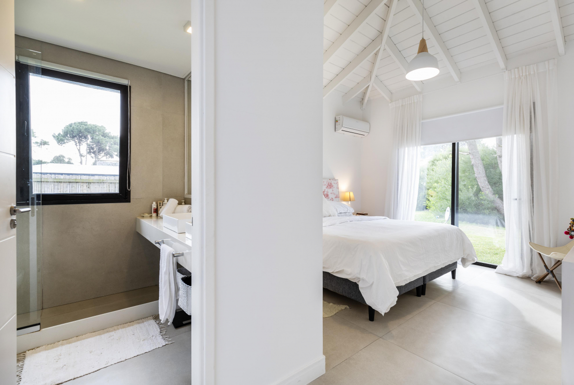 Emplazada en un terreno de mil mts, se desarrolla esta casa en una planta, distribuida en dos módulos, dentro del barrio privado Pinar del Faro.