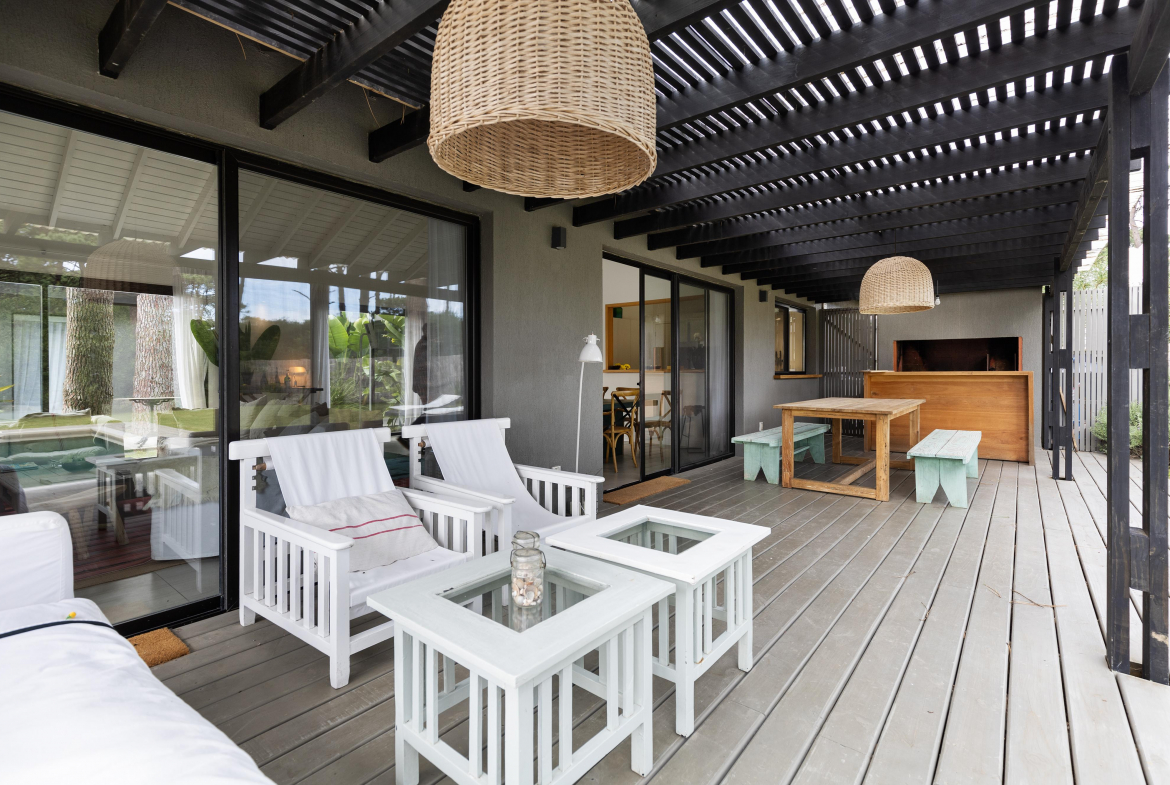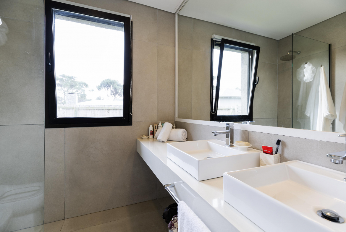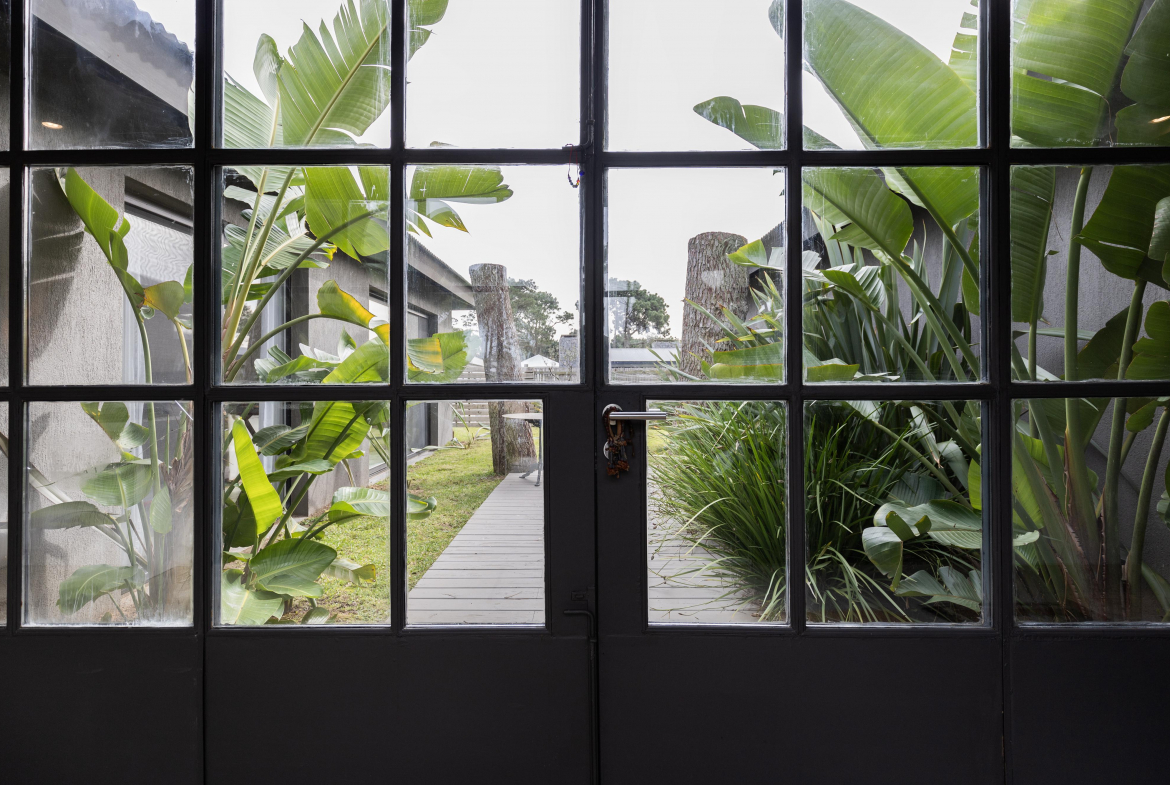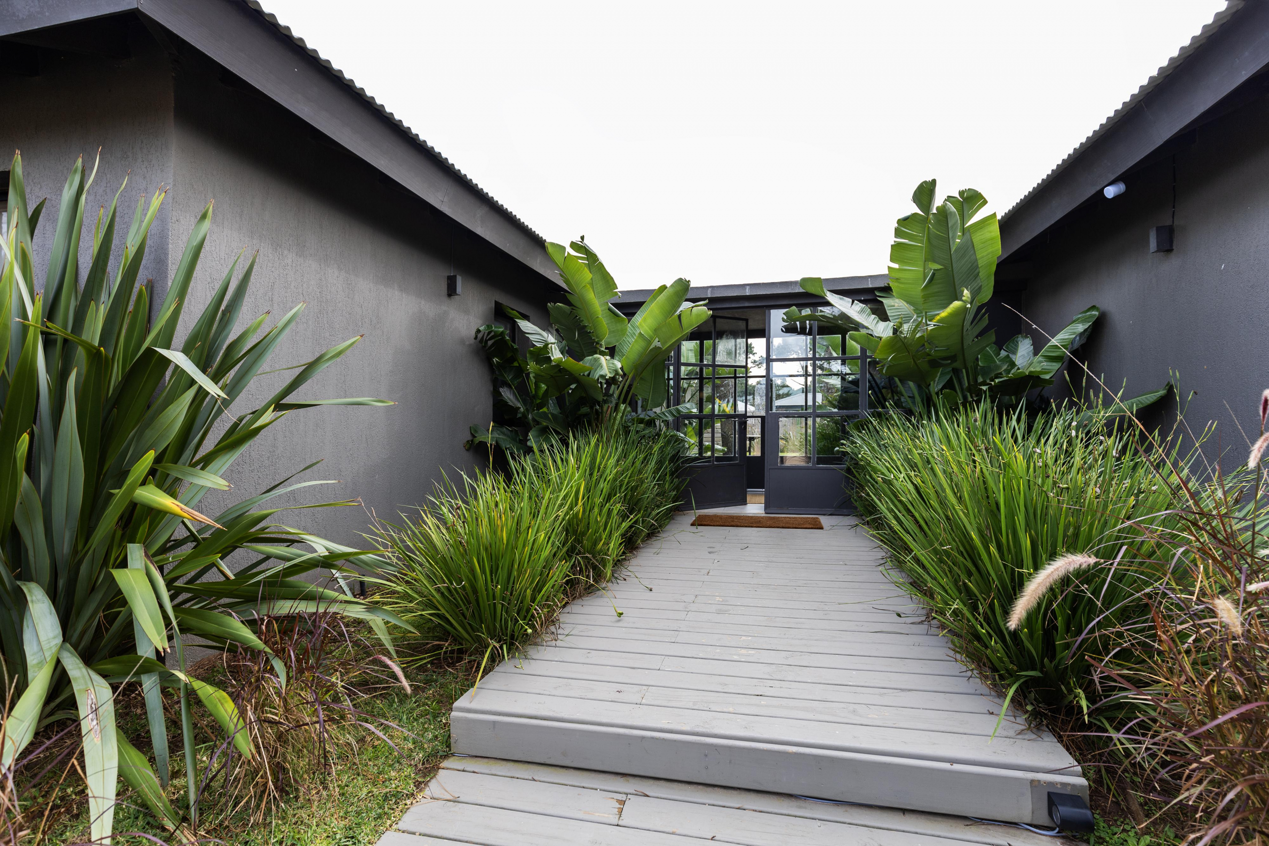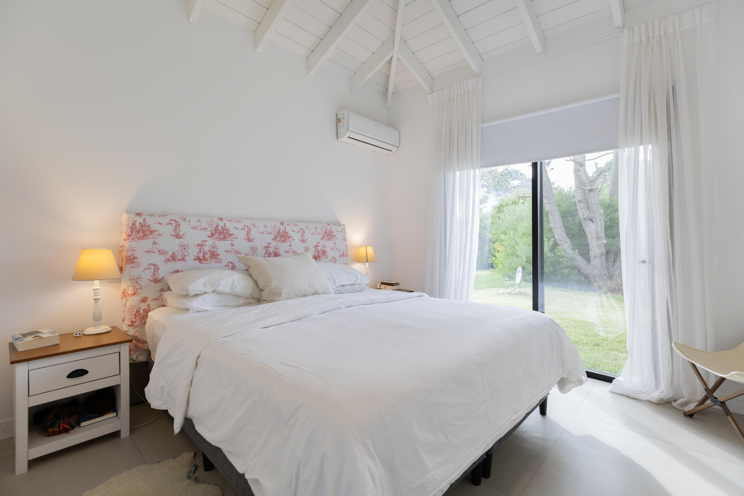 Emplazada en un terreno de mil mts, se desarrolla esta casa en una planta, distribuida en dos módulos, dentro del barrio privado Pinar del Faro.