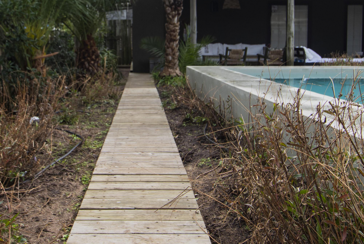 Entre ambos modulo se encuentra la pileta rodeada de hermosa vegetación, reposeras, zona de solárium y parrillero techado dentro un espacio chill out.