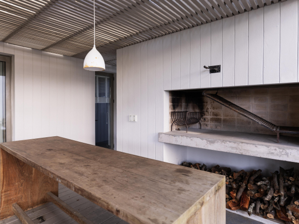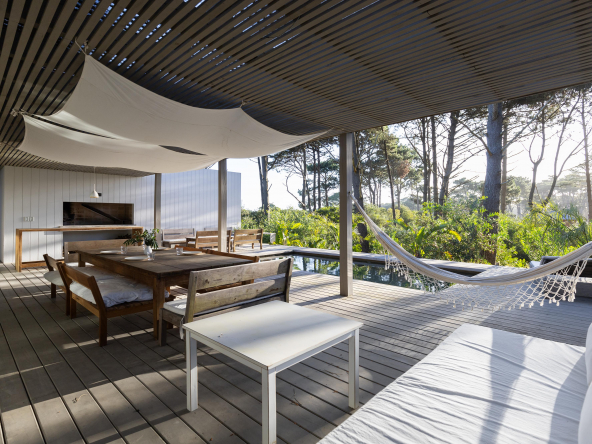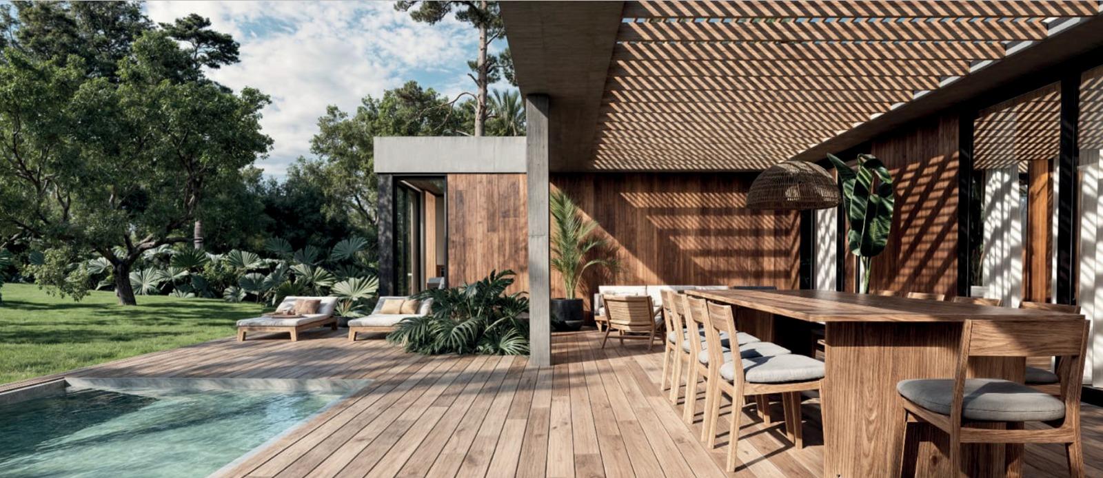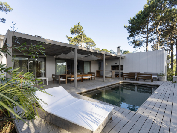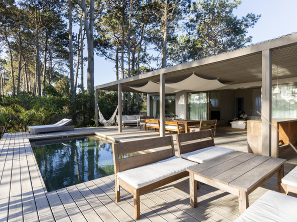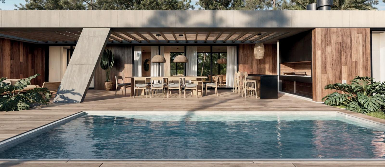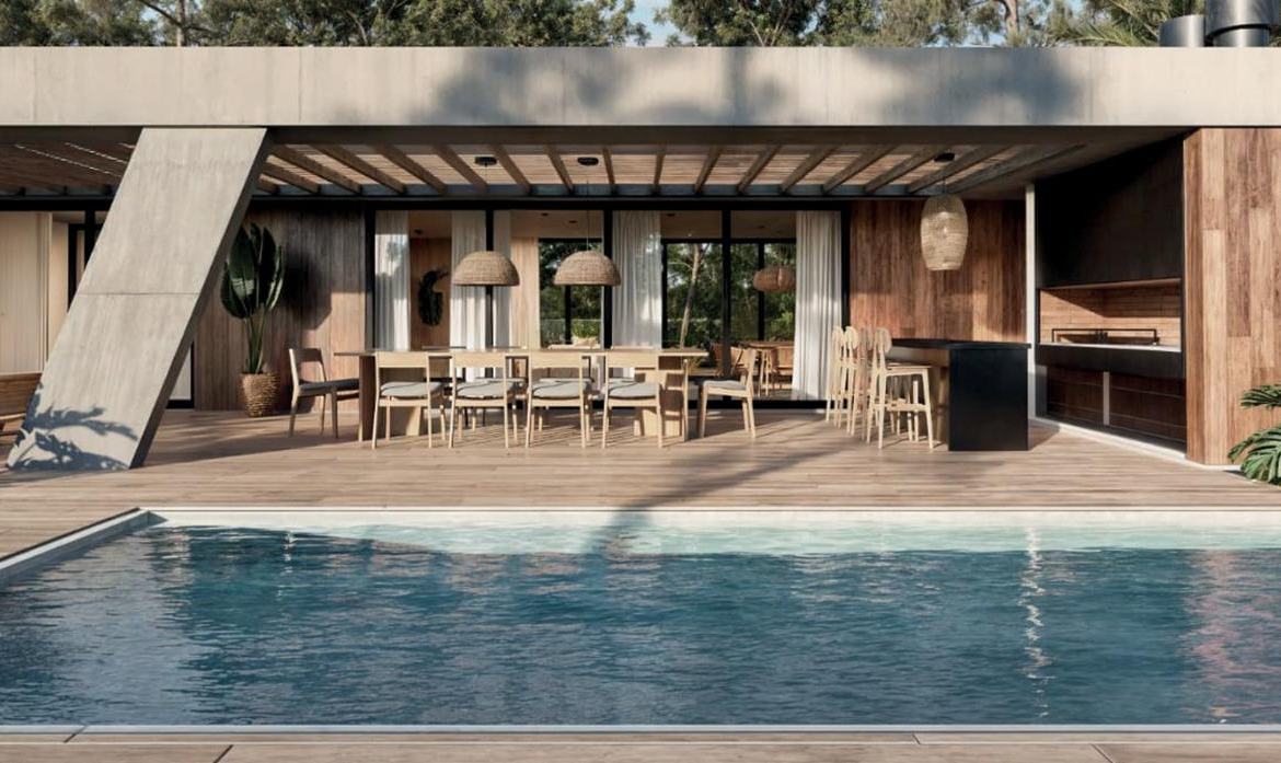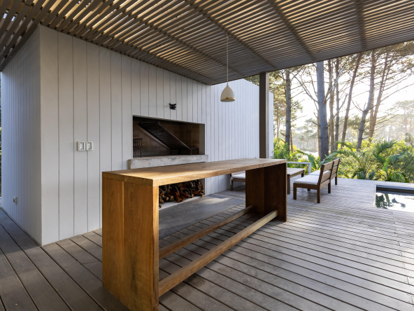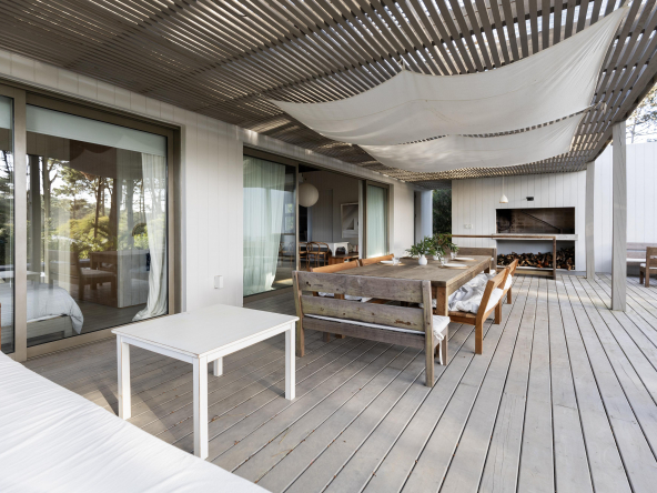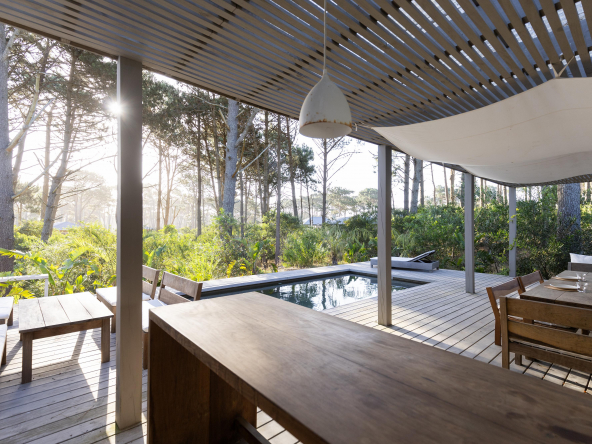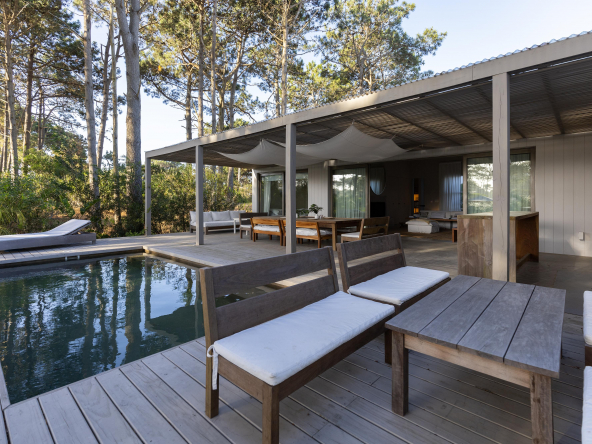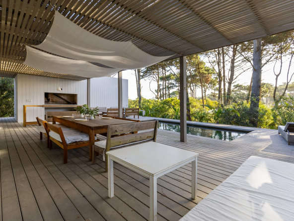 La tecnología que se emplea en su construcción será tradicional . Estructura de hormigón armado, losas vistas, muros de ticholo de 18 cm revocado y con terminación de pintura interior sobre fino en interior y de revoque texturado hacia el exterior. Tiene una apertura importante desde el comedor hacia la galería , donde hay un entablonado semi cubierto por varillas de pino tratada. También tendrá un parrillero revestido en ladrillos refractarios y una cómoda barra de servicio. Esta misma galería tiene una conexión inmediata con la piscina, que se encuentra rodeada por un deck de pino curado, con solárium.