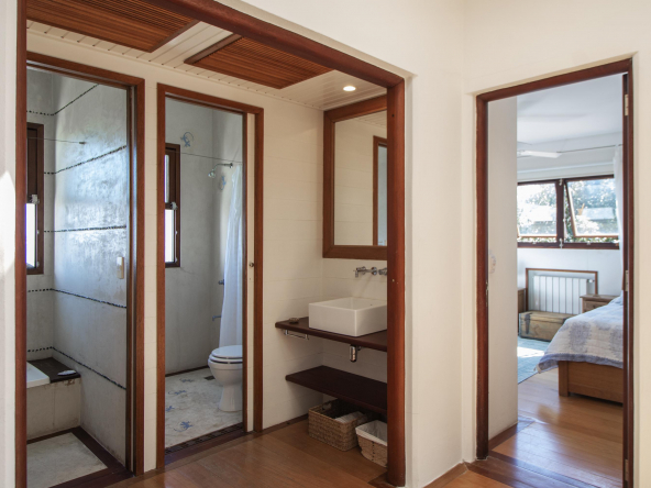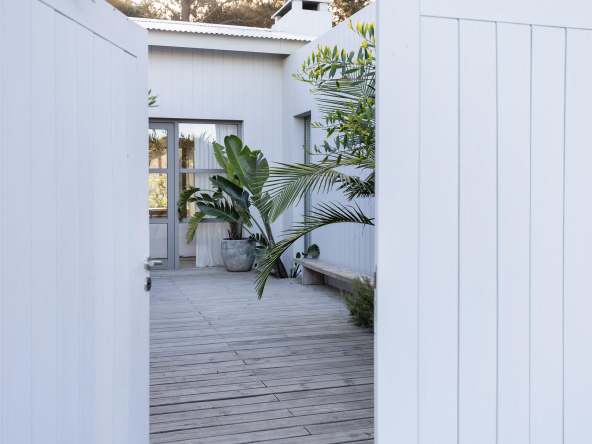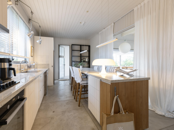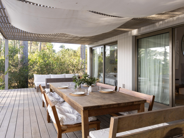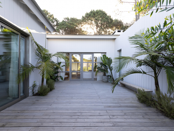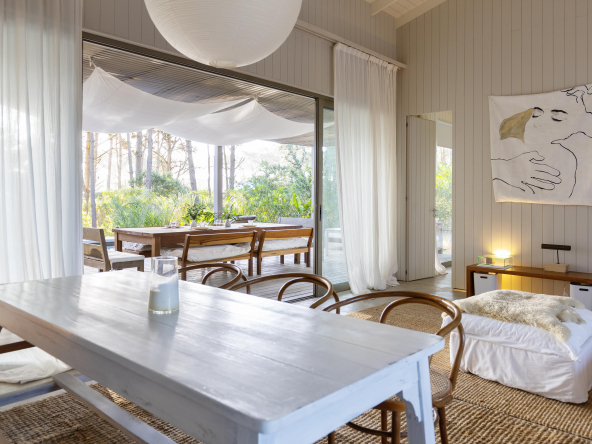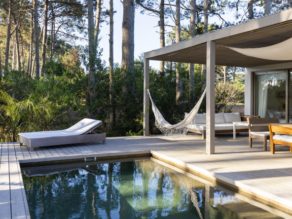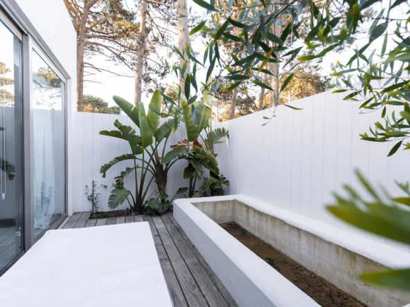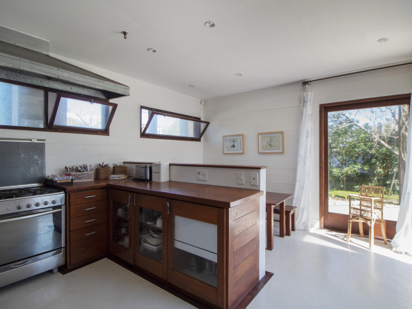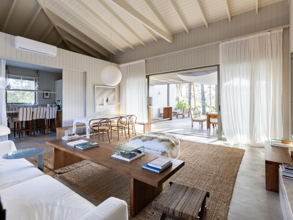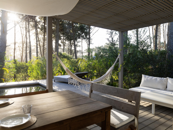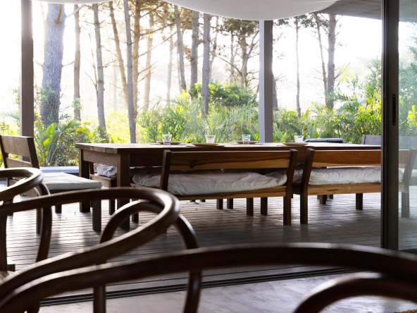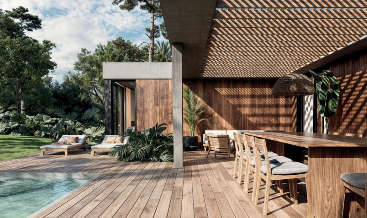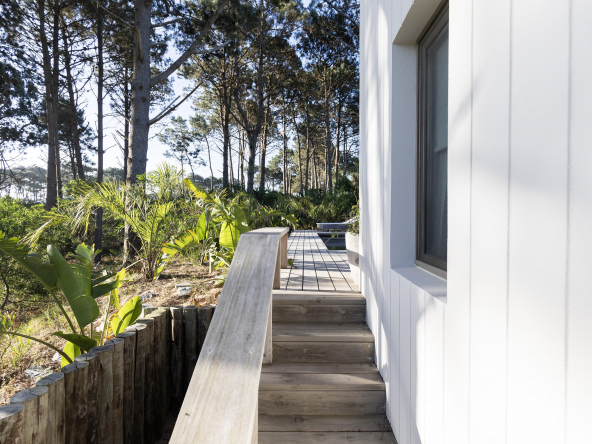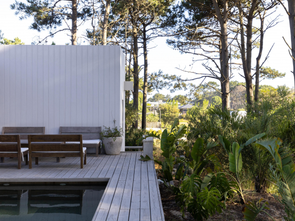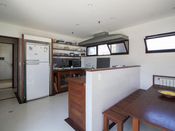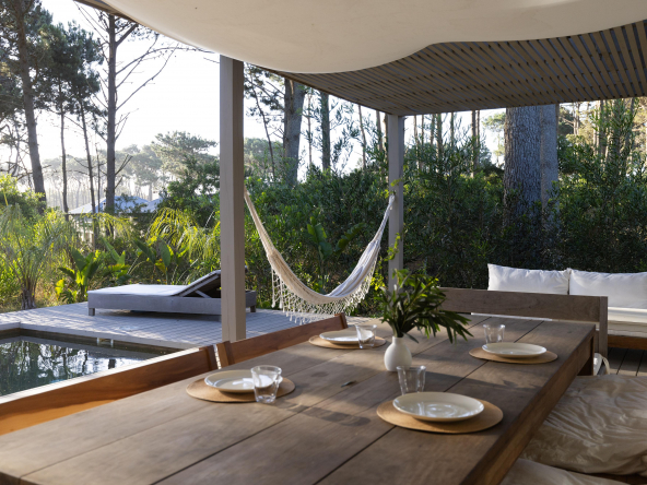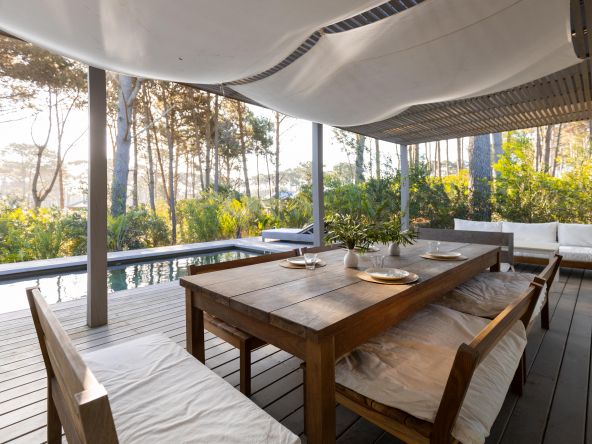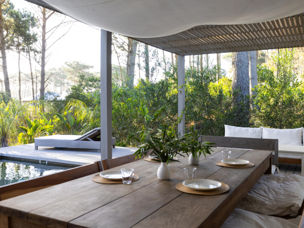 La tecnología que se emplea en su construcción será tradicional . Estructura de hormigón armado, losas vistas, muros de ticholo de 18 cm revocado y con terminación de pintura interior sobre fino en interior y de revoque texturado hacia el exterior. Tiene una apertura importante desde el comedor hacia la galería , donde hay un entablonado semi cubierto por varillas de pino tratada. También tendrá un parrillero revestido en ladrillos refractarios y una cómoda barra de servicio. Esta misma galería tiene una conexión inmediata con la piscina, que se encuentra rodeada por un deck de pino curado, con solárium.