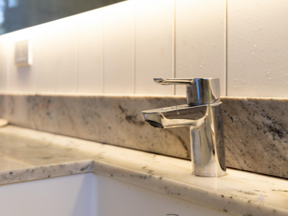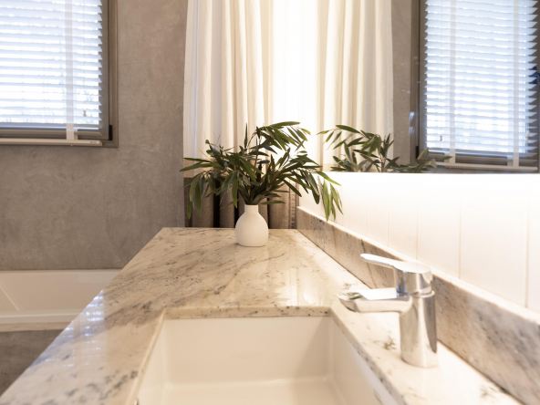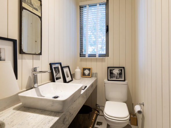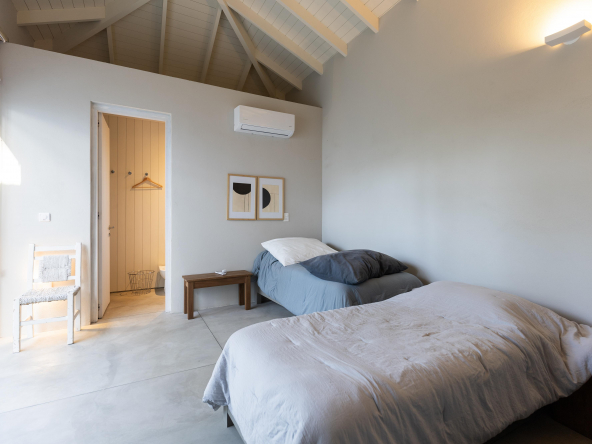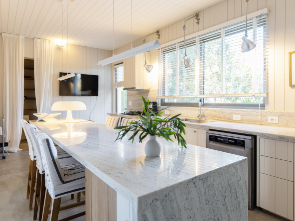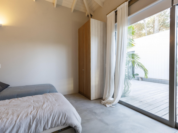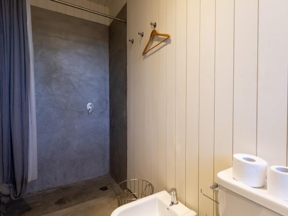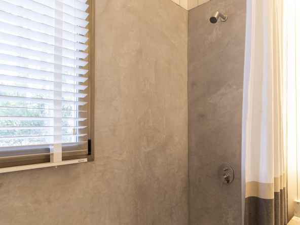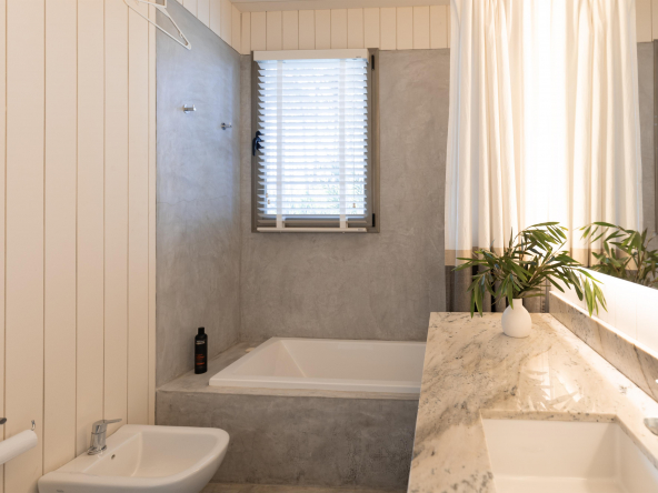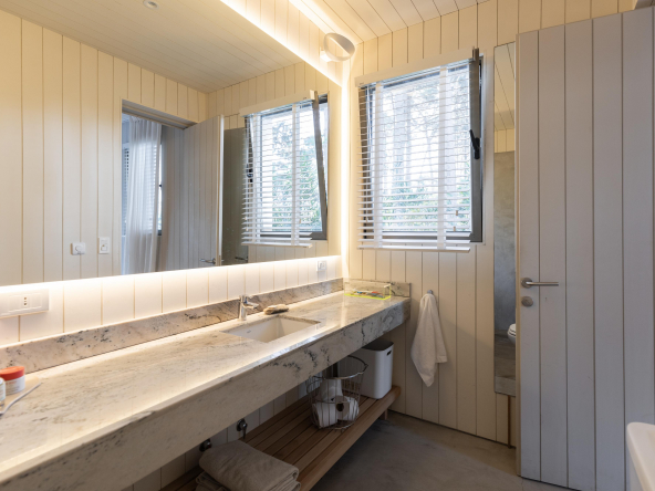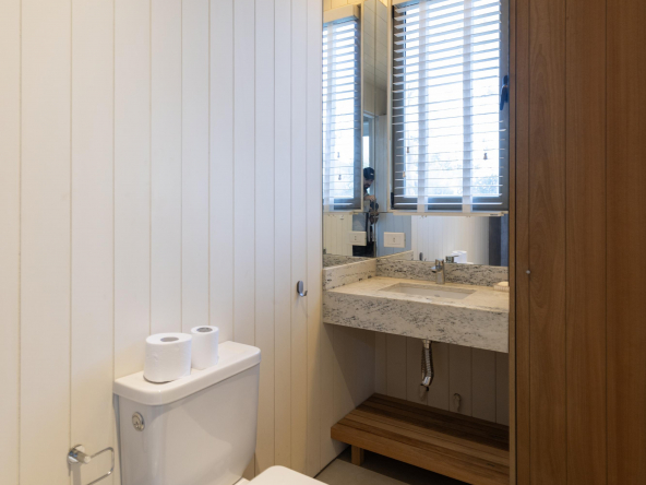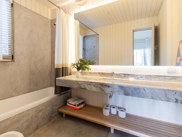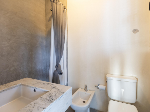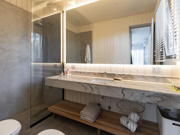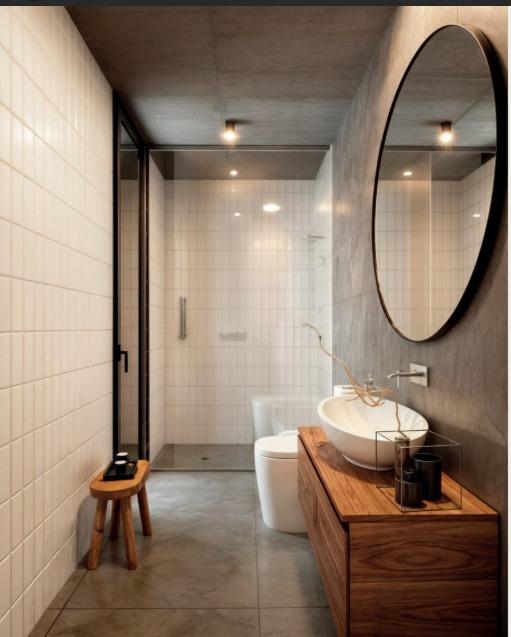 Es importante notar la gran apertura hacia el contexto a través de importantes superficies abiertas con aberturas de aluminio de primera calidad , como así también la implantación que busca respetar al máximo las preexistencias. Tanto solados interiores como revestimientos en baños serán de porcelanato corte rectificado de primera calidad , así mismo la grifería será de la marca “Ramon Sóller” con cierre cerámico.