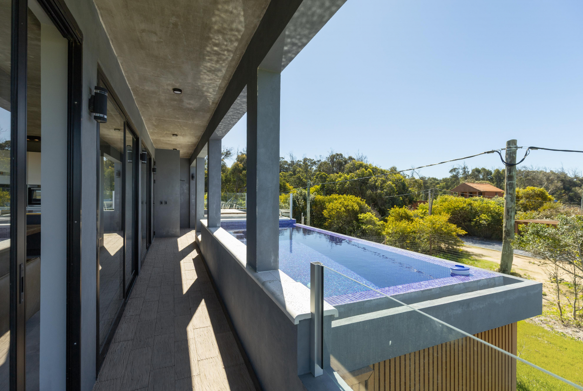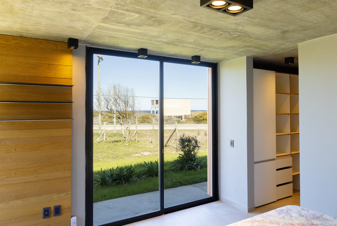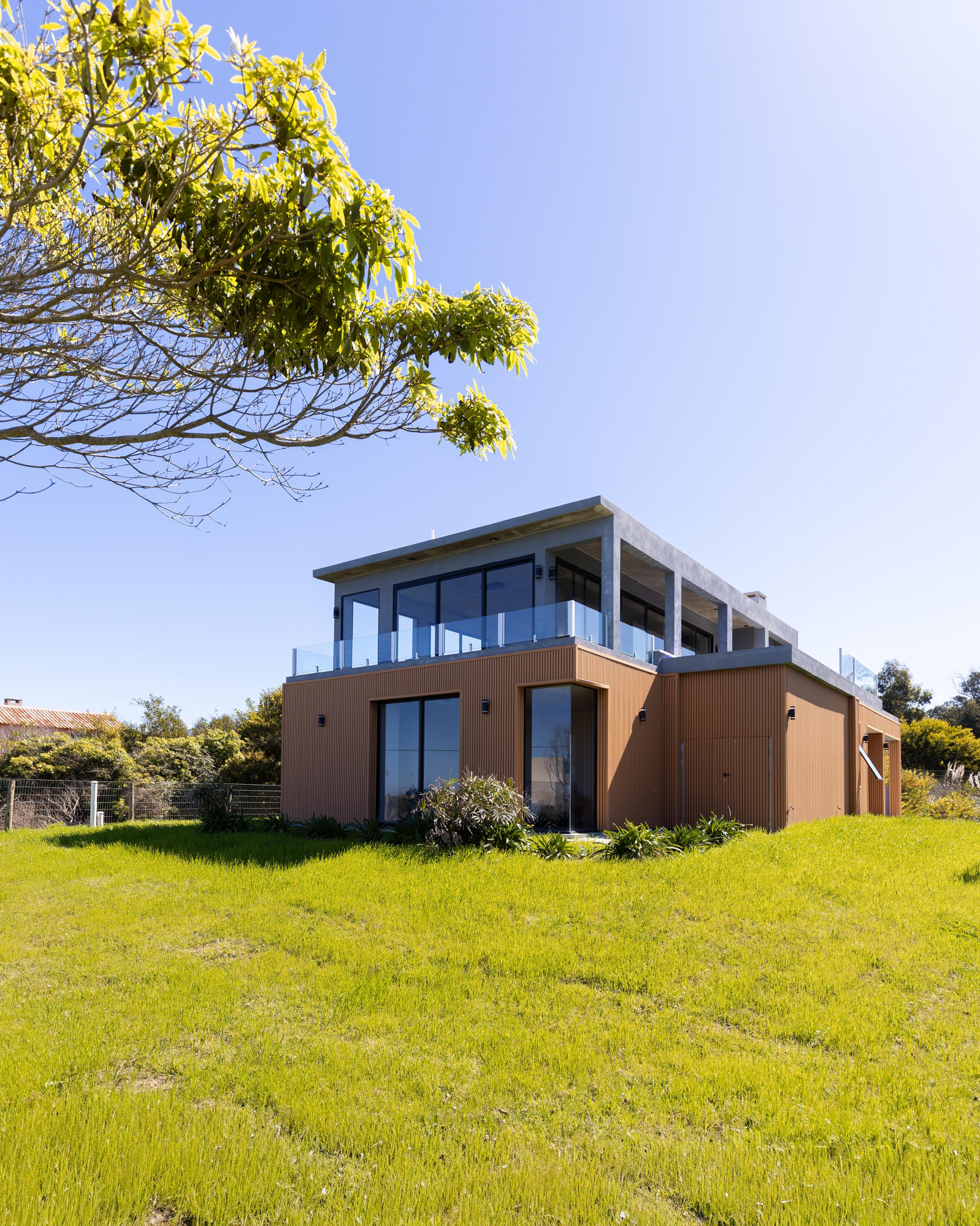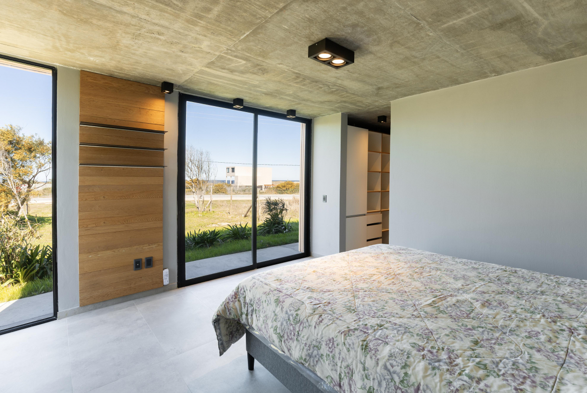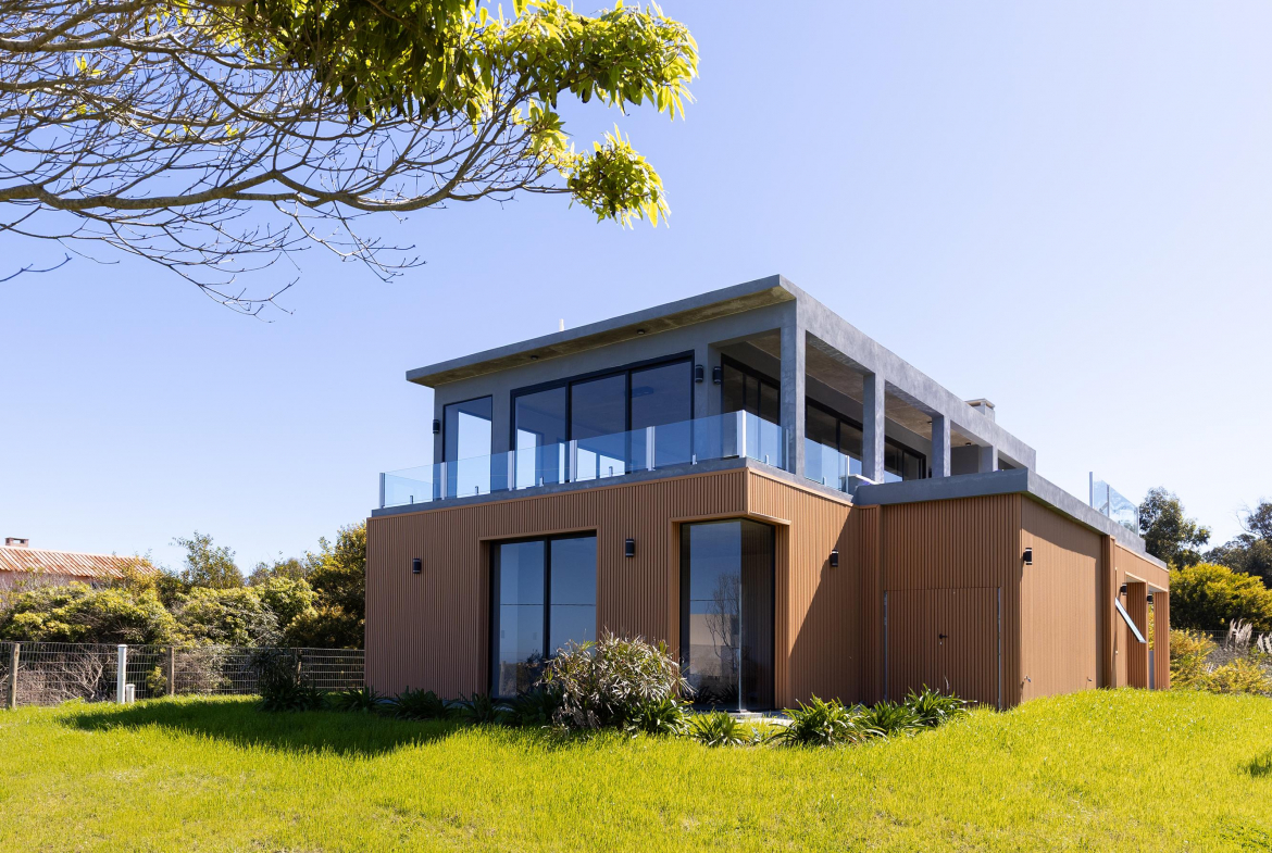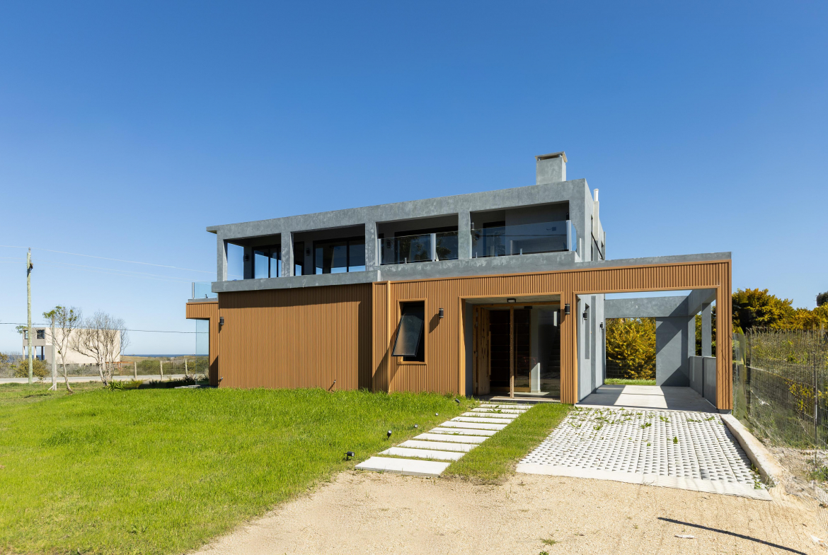 Casa elevada 2 metros sobre relleno de balastro compactado, sobre 24 bases de hormigón H30 y encadenado corrido de 22 cm. Cerramientos de aluminio con vidrios laminados, revestimiento exterior WPC, y terminaciones en porcelanato, cuarzo y maderas nobles.