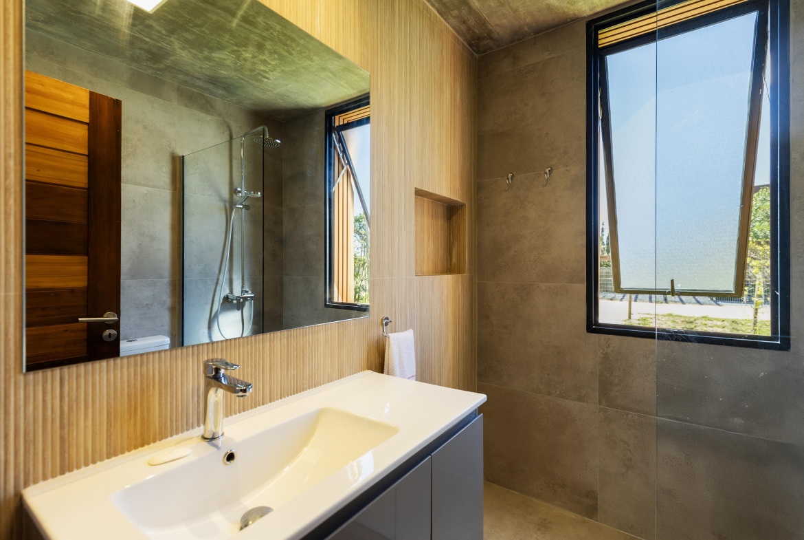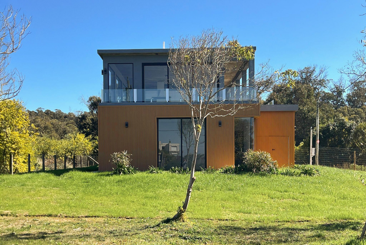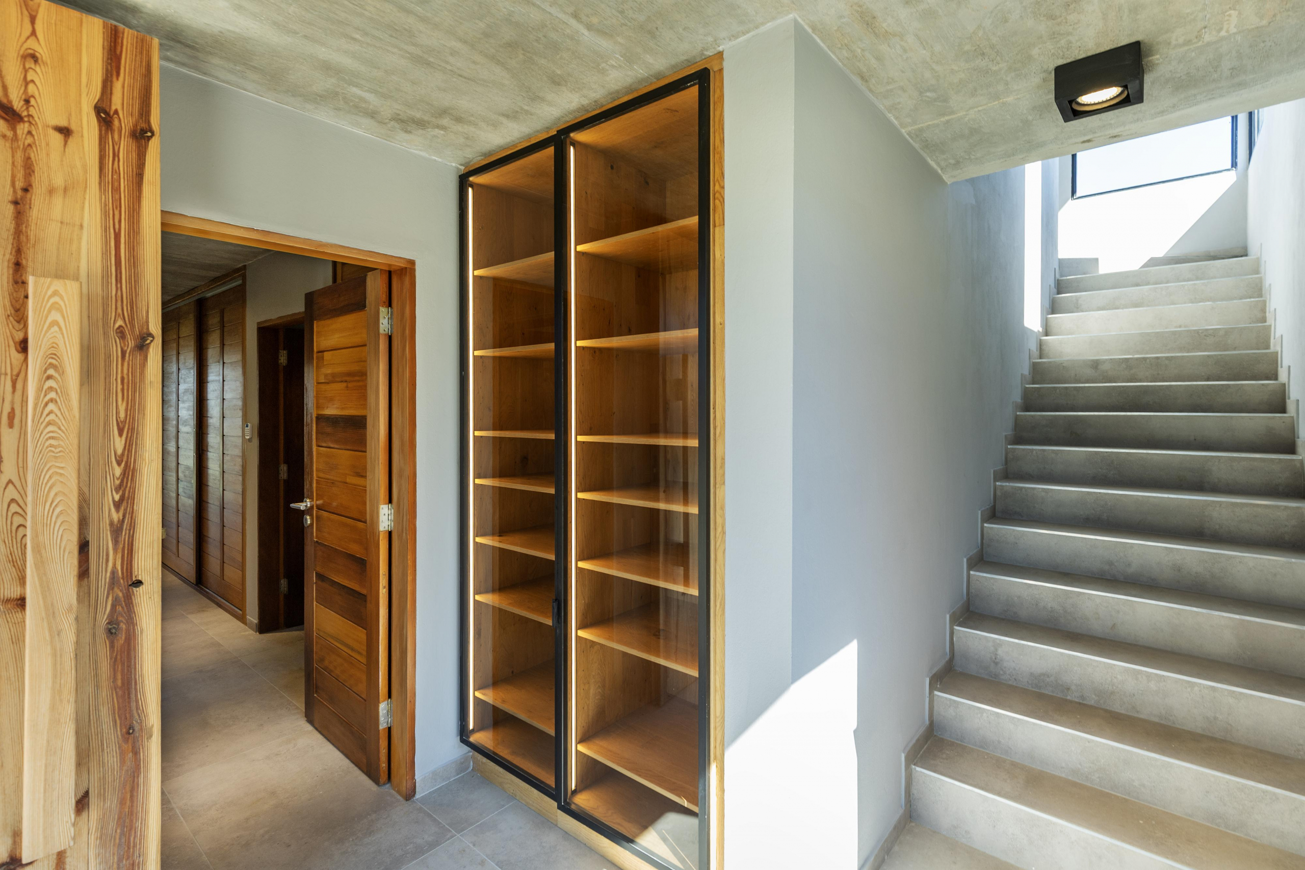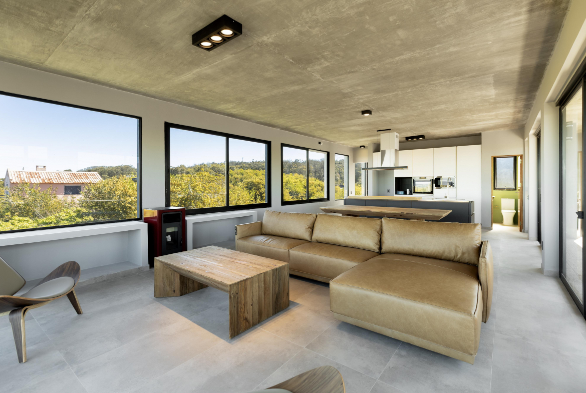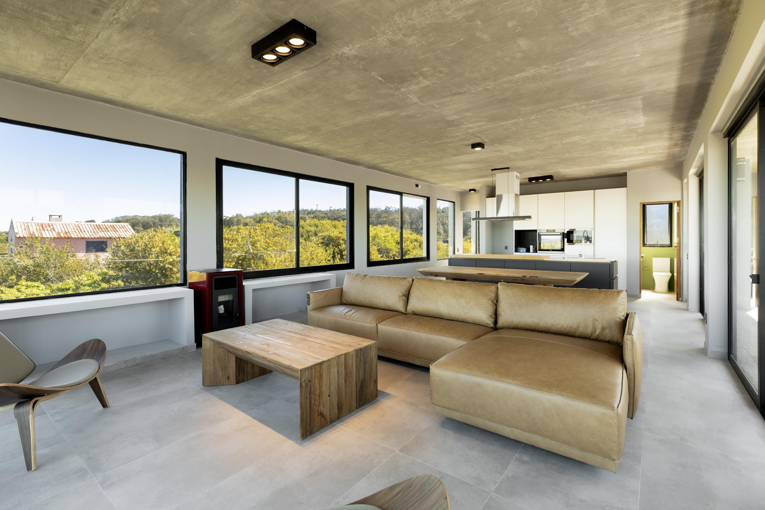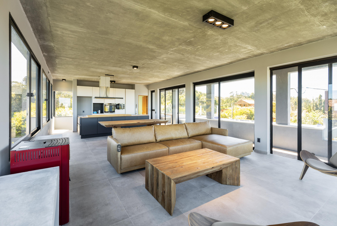 Casa elevada 2 metros sobre relleno de balastro compactado, sobre 24 bases de hormigón H30 y encadenado corrido de 22 cm. Cerramientos de aluminio con vidrios laminados, revestimiento exterior WPC, y terminaciones en porcelanato, cuarzo y maderas nobles.