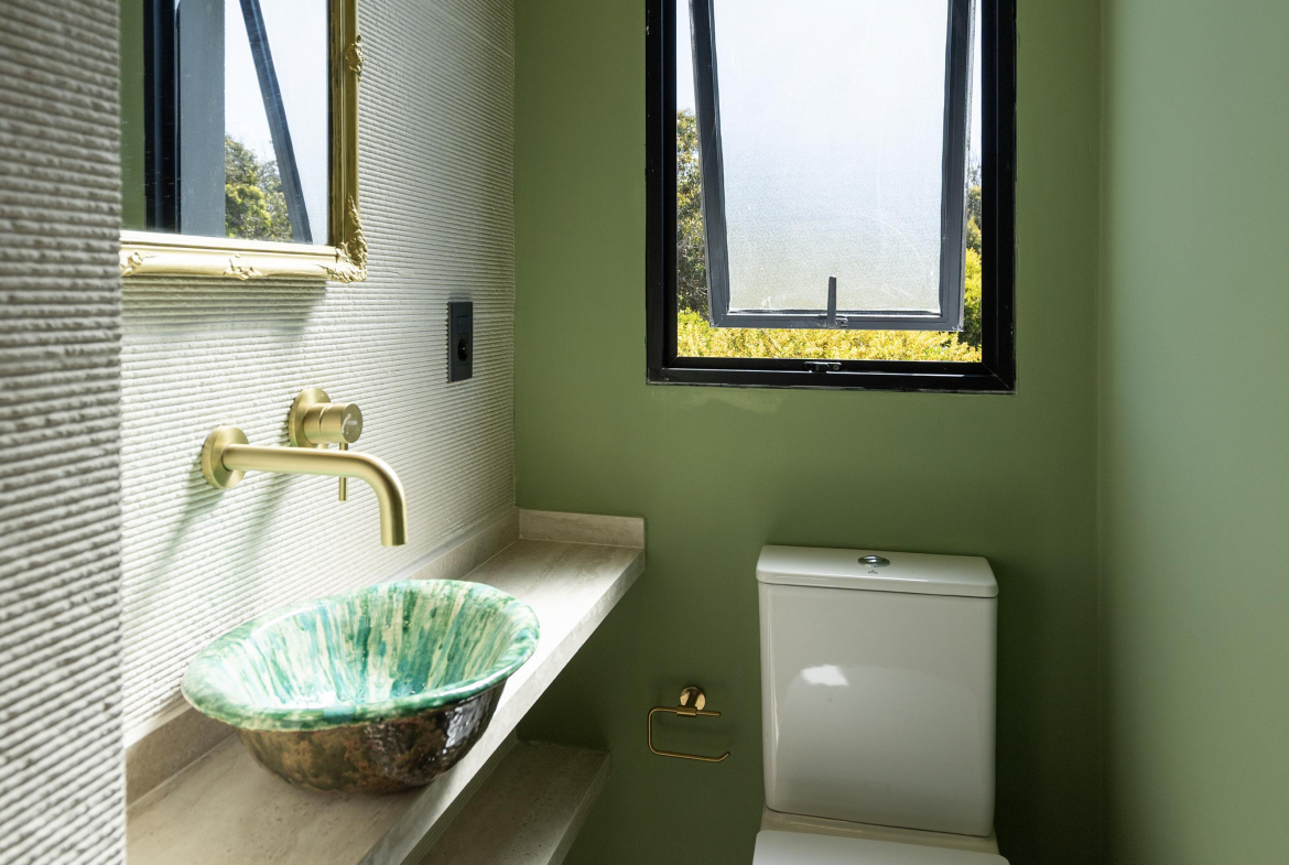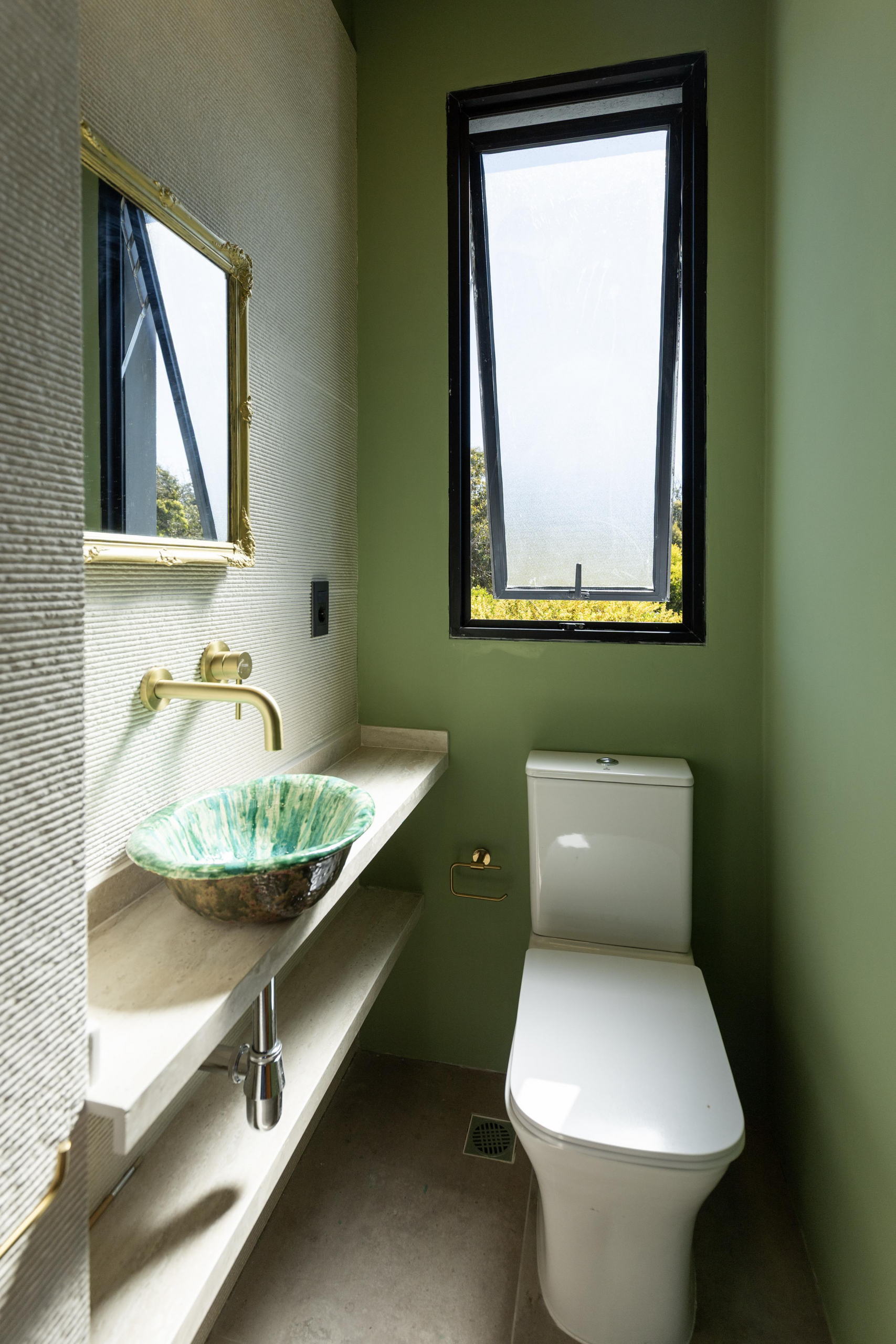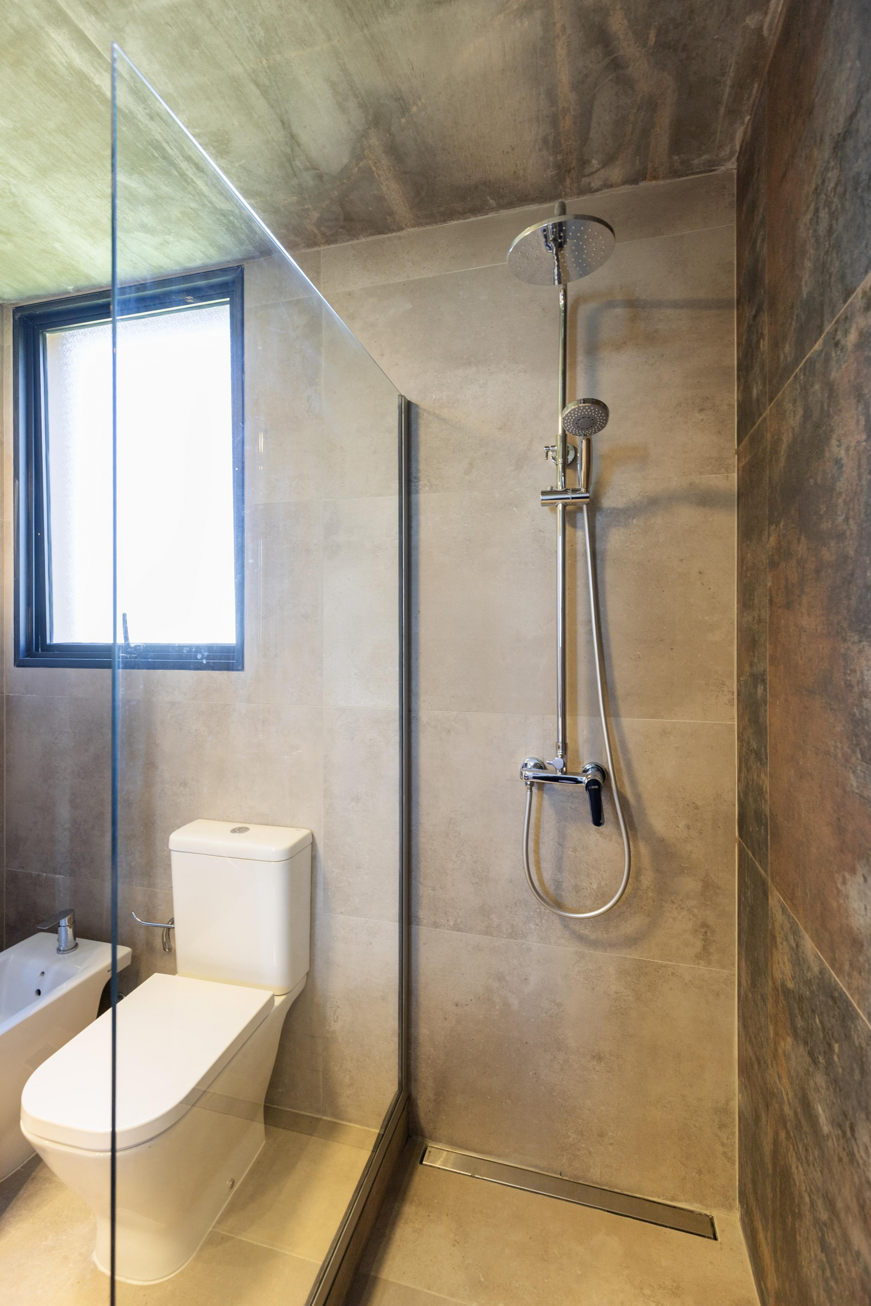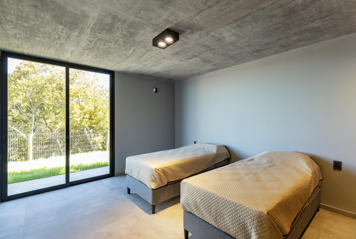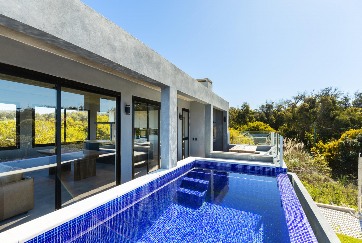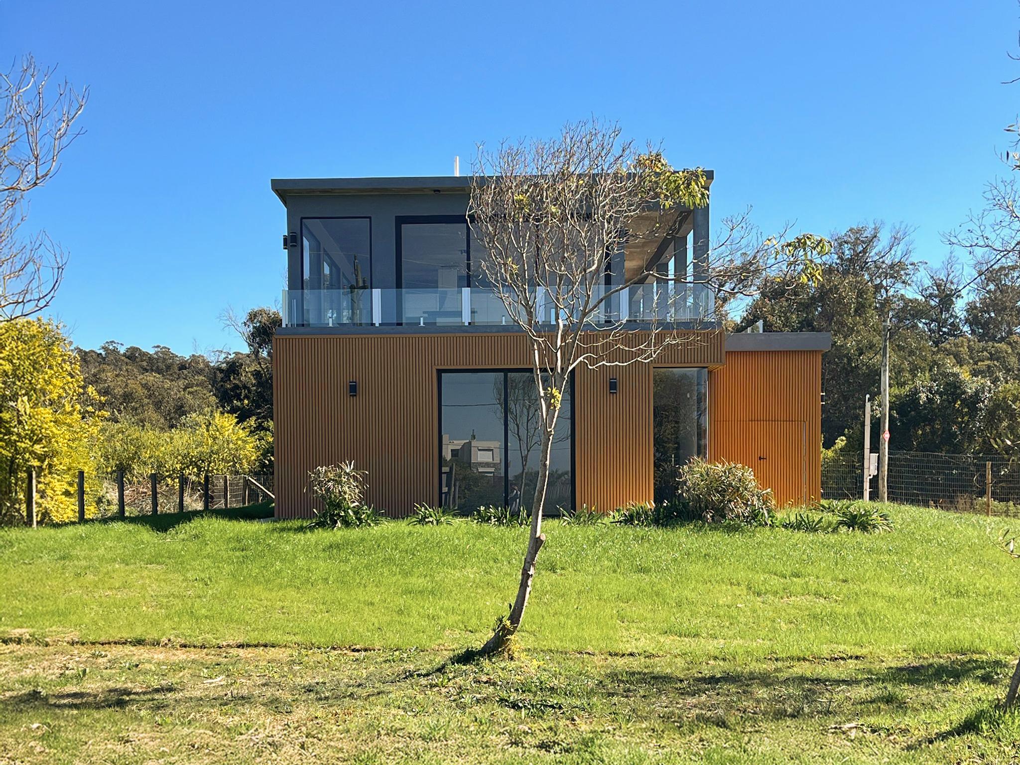 Casa elevada 2 metros sobre relleno de balastro compactado, sobre 24 bases de hormigón H30 y encadenado corrido de 22 cm. Cerramientos de aluminio con vidrios laminados, revestimiento exterior WPC, y terminaciones en porcelanato, cuarzo y maderas nobles.