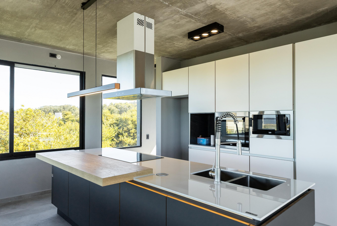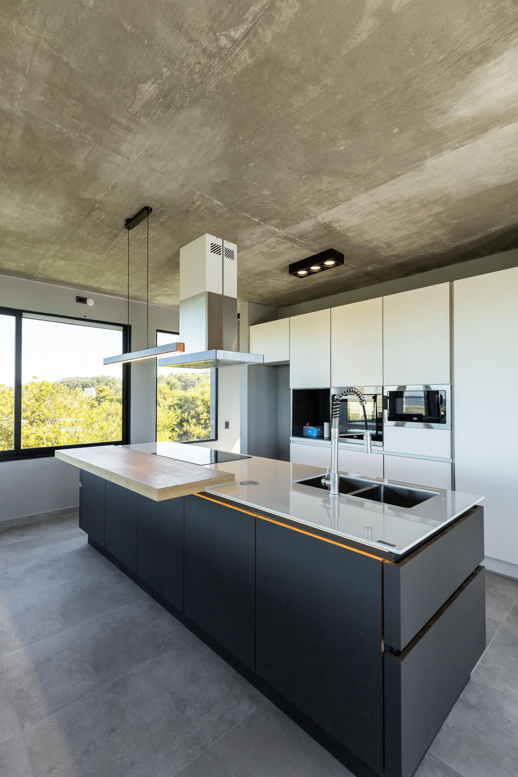 Cocina alemana Leicht con isla y mesadas de Neolit, equipada con horno, microondas, vitrocerámica y lavavajillas Beko
